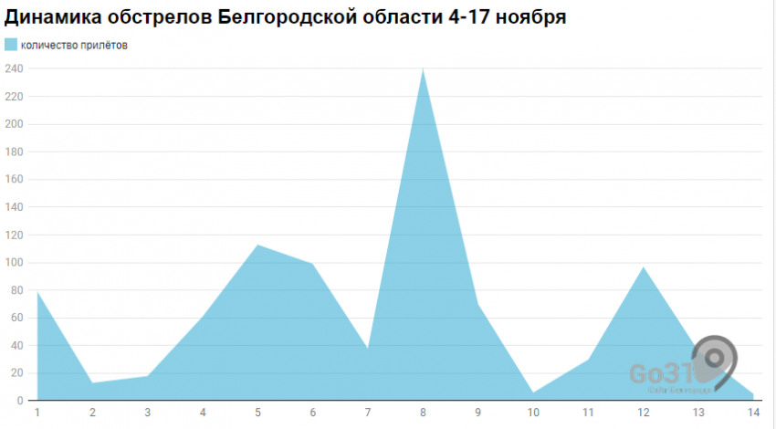 Издание Go31 представило график интенсивности обстрелов Белгородской области, а также подсчитало количество прилётов, опираясь на официальные данные правительства.