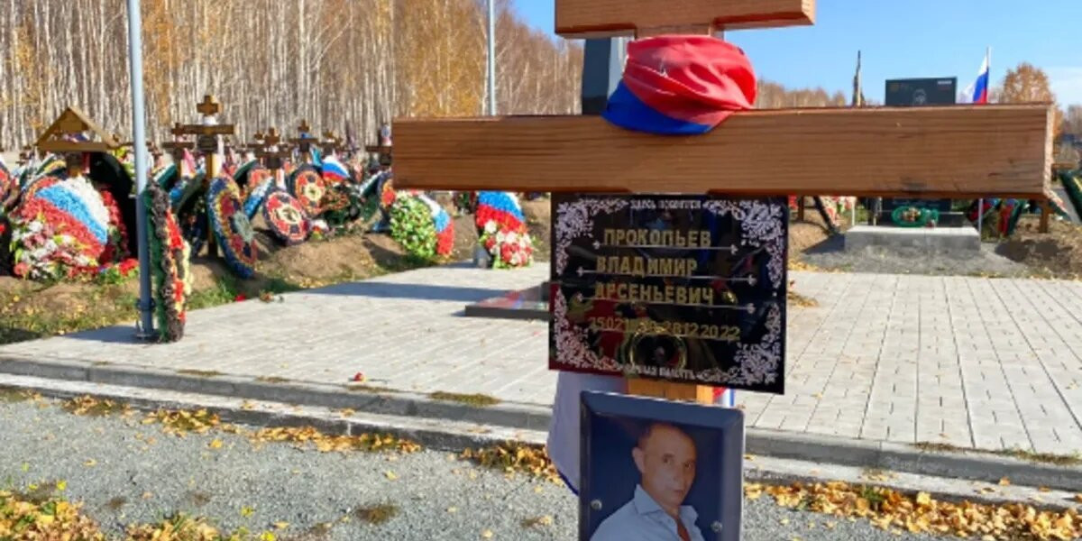 На Гусинобродском кладбище стоит «зуб Вагнера». «Здесь похоронены бойцы ЧВК Вагнер, погибшие за родину. 2022-2023».