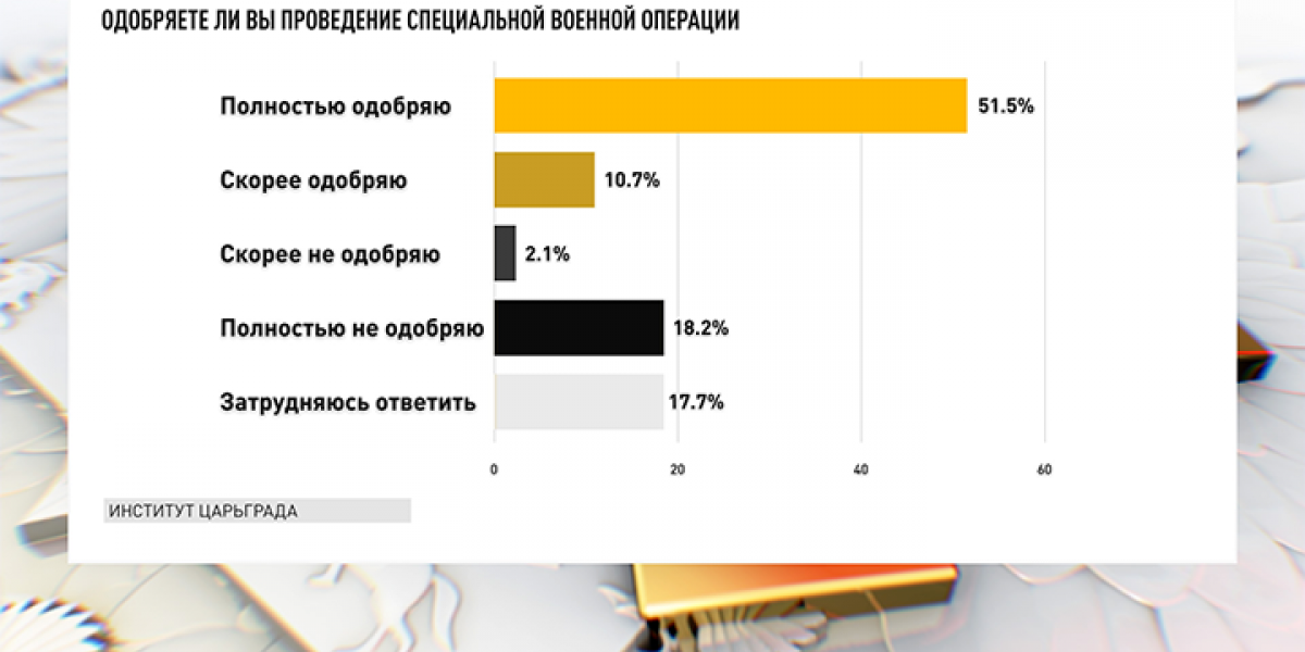 Прежде всего, затронули тему вооруженного конфликта. Русское общество, как показывают данные социологии, вполне настроено на победу. 62,2% процента респондентов одобряет проведение операции против киевского режима, не одобряют 20,3%.