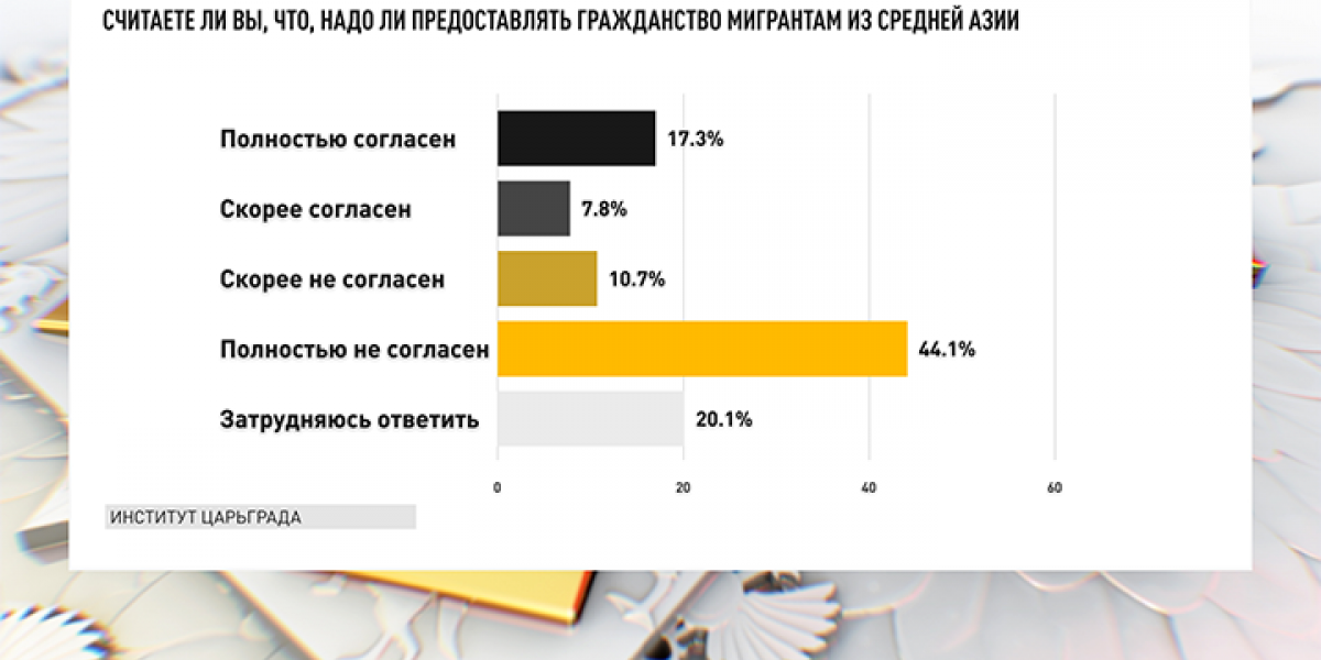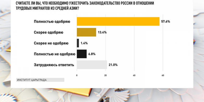 Между тем, именно вопрос паспортизации гастарбайтеров – наиболее насущный и острый. Здесь необходимо провести разъяснительную работу в обществе, потому что многие не понимают последствий, к которым эта паспортизация ведёт. В общем же и целом подавляющее большинство жителей России требуют от власти ужесточения миграционного законодательства – 71%, против — 8,2% либерально настроенной к мигрантом публики. Итого получается, что соотношение в вопросе миграции примерно 60-70% vs 8-10%.