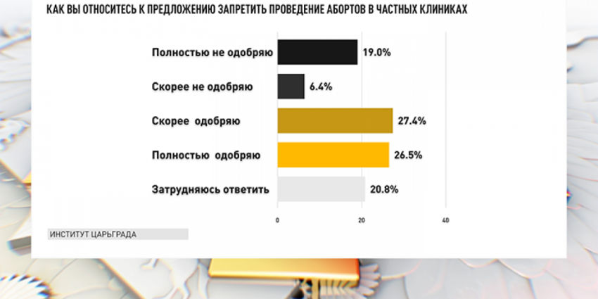 Мнения относительно абортов также благоприятно для государственников. В российском обществе фиксируется здравое большинство. 53,9% хотят запретить искусственное прерывание беременности в частных медицинских клиниках, нацеленных исключительно на получение прибыли (против – 25,4%).