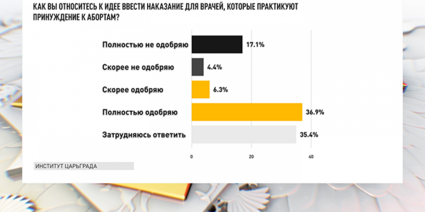 43,2% опрошенных поддерживают применение репрессивных мер в отношении врачей, принуждающих пациентку к аборту. Против данной меры выступает 21,5% респондентов.