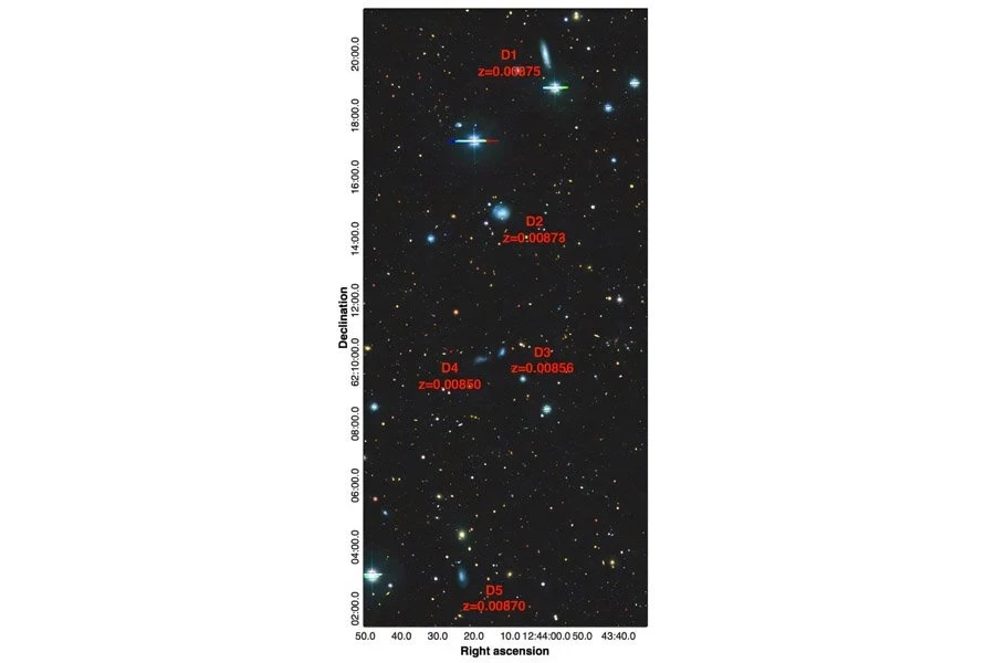 Однако теперь группа астрономов во главе с Санджайей Пауделом из Университета Ёнсе сообщает о находке такой редкой группы, которая содержит по меньшей мере пять карликов. Открытие основано на анализе данных различных астрономических обзоров, включая Sloan Digital Sky Survey (SDSS).