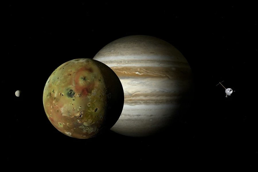 Ио — ближайший к Юпитеру по величине спутник. Он движется по эллиптической орбите вокруг планеты, совершая оборот вокруг газового гиганта за 42,5 часа, а также находится в резонансе с другими крупными спутниками. Ио сжимается и тянется, как никакой другой мир. Его вулканизм был обнаружен благодаря космическому аппарату Voyager 1 Линдой Морабито из Лаборатории реактивного движения NASA еще в 1979 году.