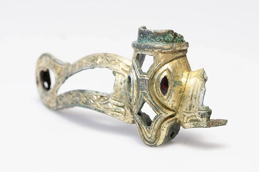 Фрагмент шлема, найденный в 2024 году, с его золотым покрытием, драгоценными камнями и замысловатым орнаментом в виде животных вскоре будет блистать в витрине музея Лейре. «Находка частей шлема — редкое явление в Дании. Этот фрагмент принадлежит, должно быть, одному из самых великолепных шлемов Скандинавии», — говорит Джули Нильсен, археологический директор ROMU.