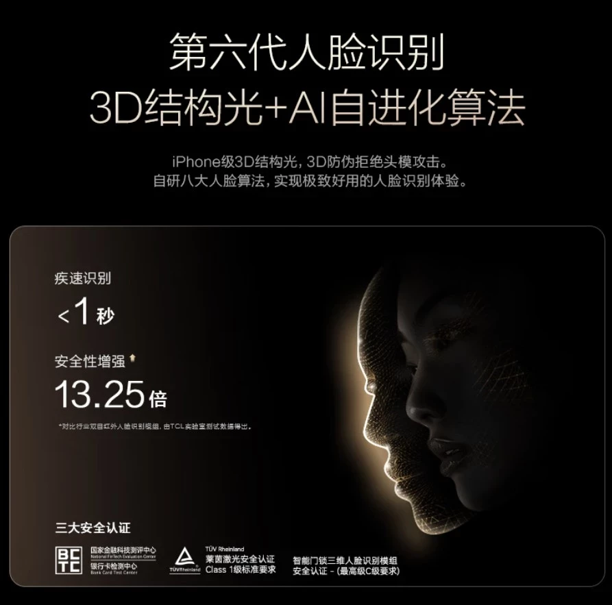 Замок TCL K7G Max выполнен из алюминиевого сплава и базальтового стекла, что придаёт устройству премиальный внешний вид. Конструкция дополнена технологией шумоподавления, позволяющей тихо закрывать или запирать дверь.