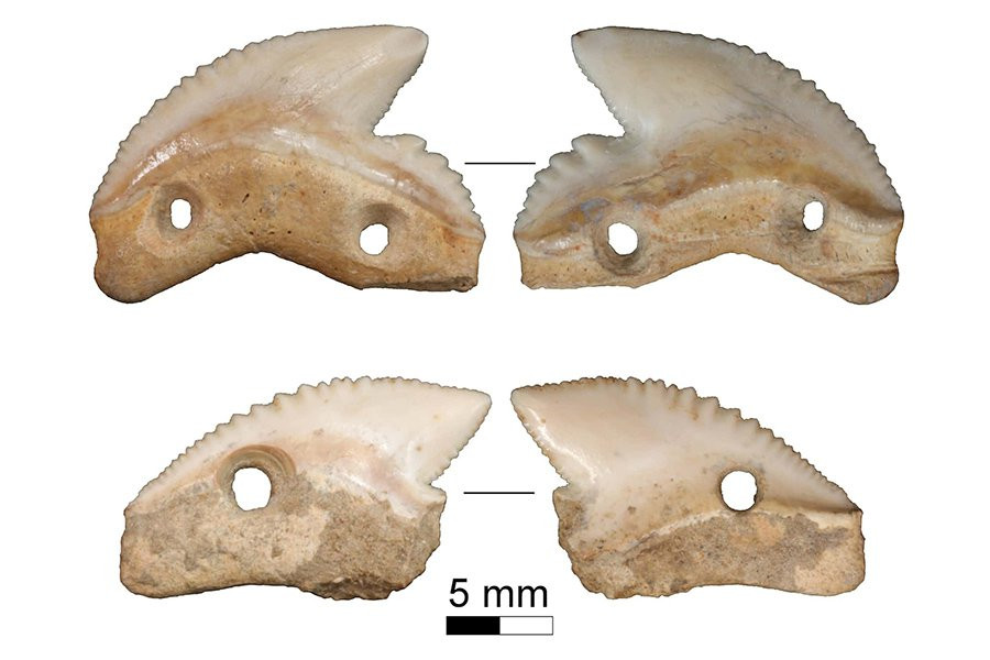 Зубы тигровой акулы длиной около двух метров имели отчетливую перфорацию. Дальнейший анализ показал, что эти зубы были прикреплены к ручке с использованием смеси минеральных, растительных и животных материалов, а также нитей растительного происхождения.