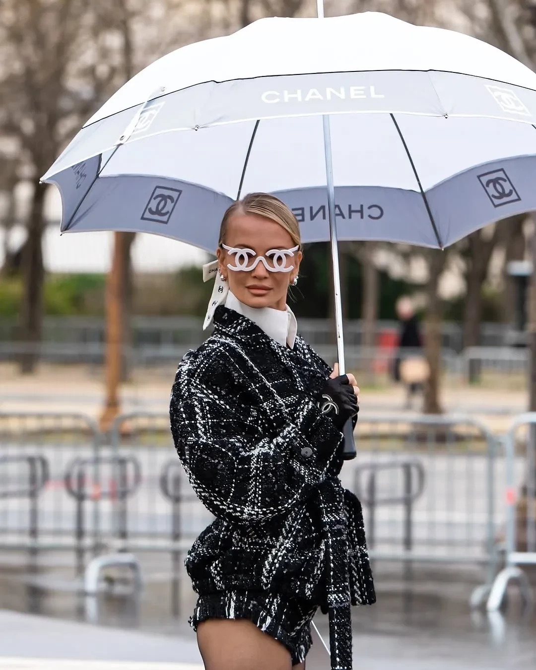 На показе Chanel Татьяна появилась в твидовом костюме модного дома с трусами-шортами. Акцентом в образе стали очки в форме логотипа бренда и фирменный зонт. На шоу Elie Saab Корсакова пришла в бежевом тренче-боди, леопардовых ботфортах и с сумкой в виде сердца, а на Jean Paul Gaultier надела кожаные трусы и микрожакет коричневого оттенка.