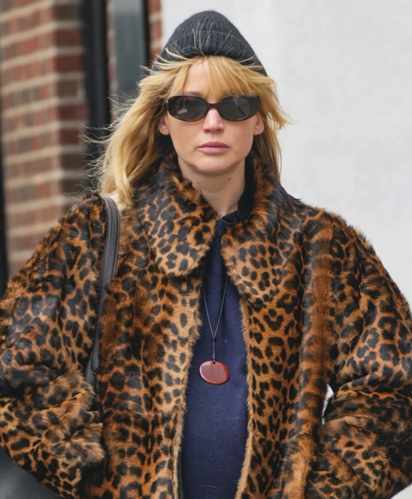 Беременная вторым ребёнком Дженнифер Лоуренс попала в объективы папарацци на прогулке в Нью-Йорке. 34-летняя голливудская актриса была одета в леопардовое пальто из шерсти пони бренда By Malene Birge, стоимостью пять тысяч долларов (около 455 тысяч рублей). Свой образ она дополнила спортивными джоггерами, ботинками челси Jil Sander, сумкой The Row, чёрной шапкой и солнцезащитными очками.
