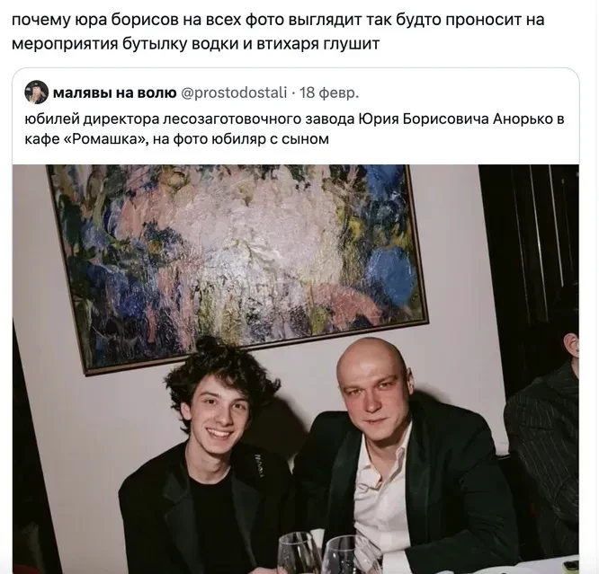 В сети завирусилось фото Юры Борисова, снятое во время вечеринки на премии BAFTA. На снимке он сидит за столом вместе с Марком Эйдельштейном, рядом с ним несколько бокалов. Поза, внешний вид и расслабленное выражение лица Борисова рассмешили русскоязычных пользователей интернета и вызвали самые разные ассоциации — с батей, "тем самым дядей", персонажем из 90-х и даже "директором лесозаготовительного завода". Теперь в соцсетях люди придумывают смешные брутальные подписи к этой фотографии и шутят над актёром. Интересно, что в фильме "Анора" героя Борисова полюбили именно за такой вайб.