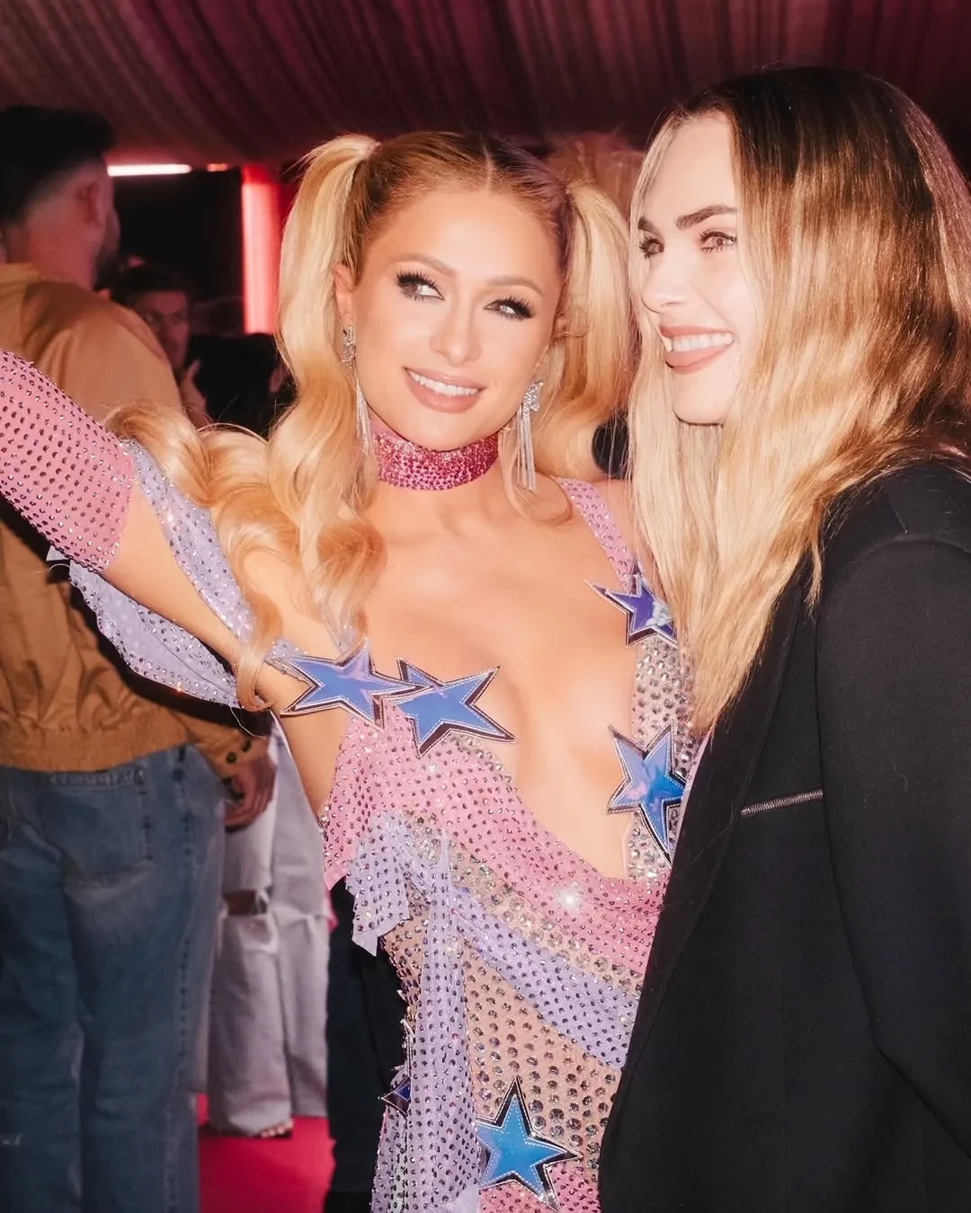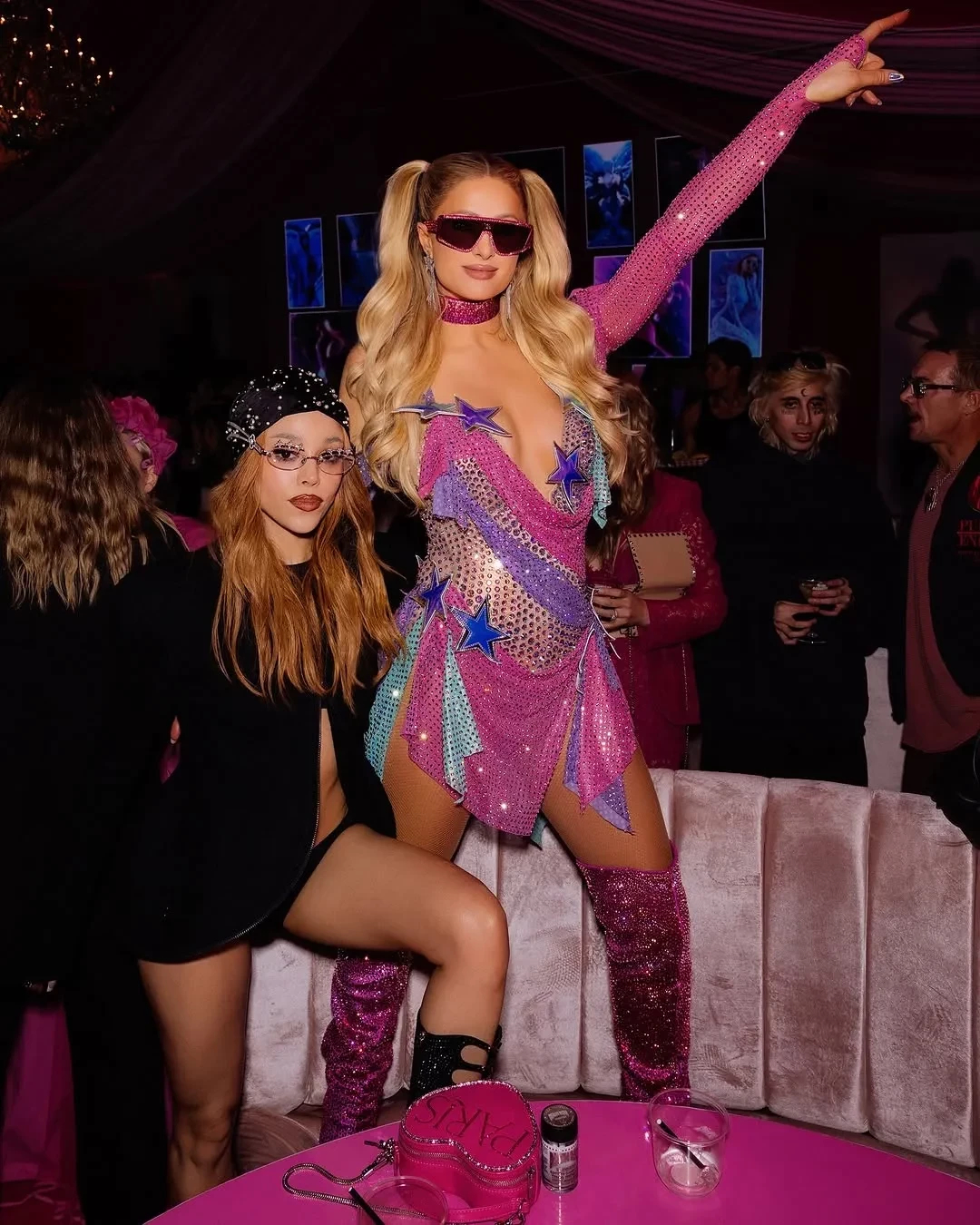 "Только иконы собрались на лучшей вечеринке этого года! Я чувствовала себя любимой, празднуя свой день рождения с таким количеством друзей! Спасибо всем, кто пришёл и был со мной! Люблю вас всех! Не могу дождаться следующего года!" — написала Хилтон в соцсетях. Звезда выбрала для вечера короткое розово-фиолетовое платье и сапоги со стразами, солнцезащитные очки и чокер в тон. Образ напомнил наряд Пэрис на её вечеринке в честь 21-летия, который впоследствии стал культовым: платье и чокер Julien Macdonald с тысячами кристаллов Swarowski.