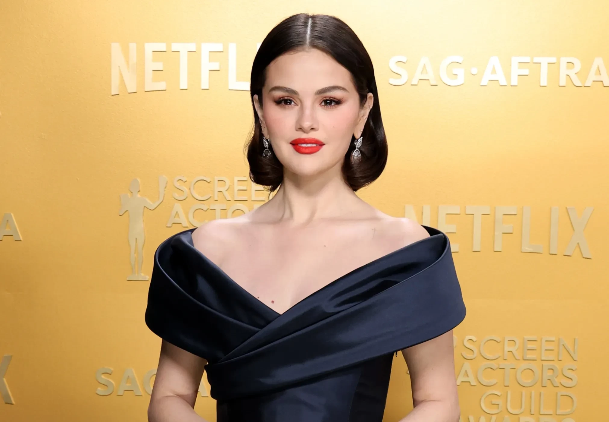 В сети обсуждают новый выход 32-летней Селены Гомес на церемонии вручения премии Гильдии киноактёров США. Певица появилась на красной дорожке в чёрном платье Celine с открытыми плечами.
