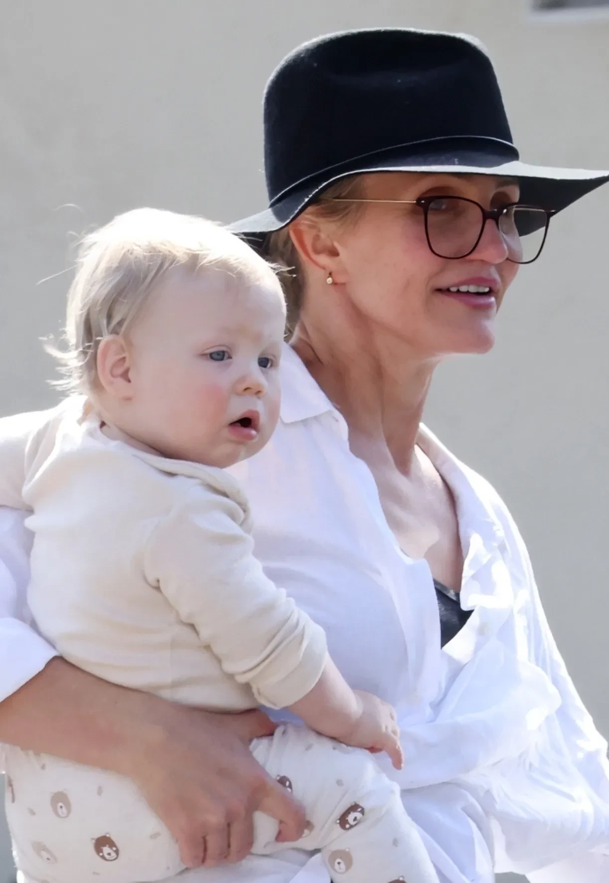 Для появления на публике Диас выбрала чёрные брюки и шляпу в тон, а также свободную белую рубашку. Сына она несла к автомобилю на руках.