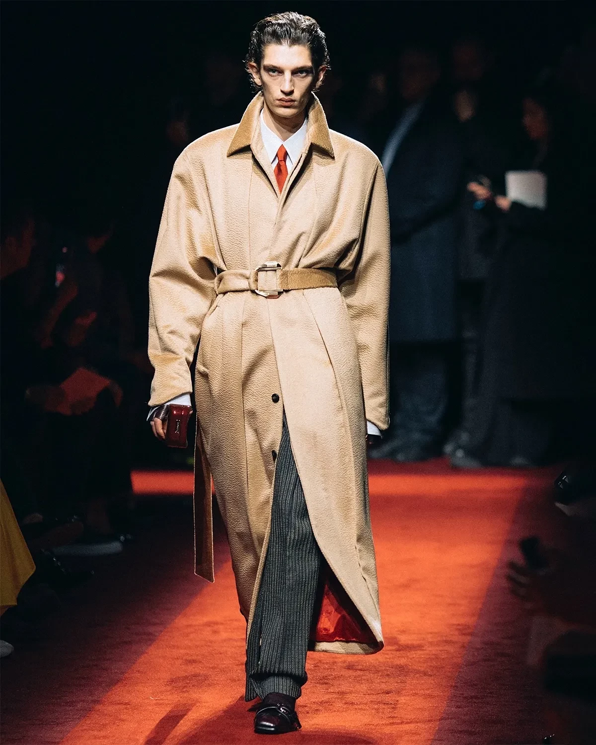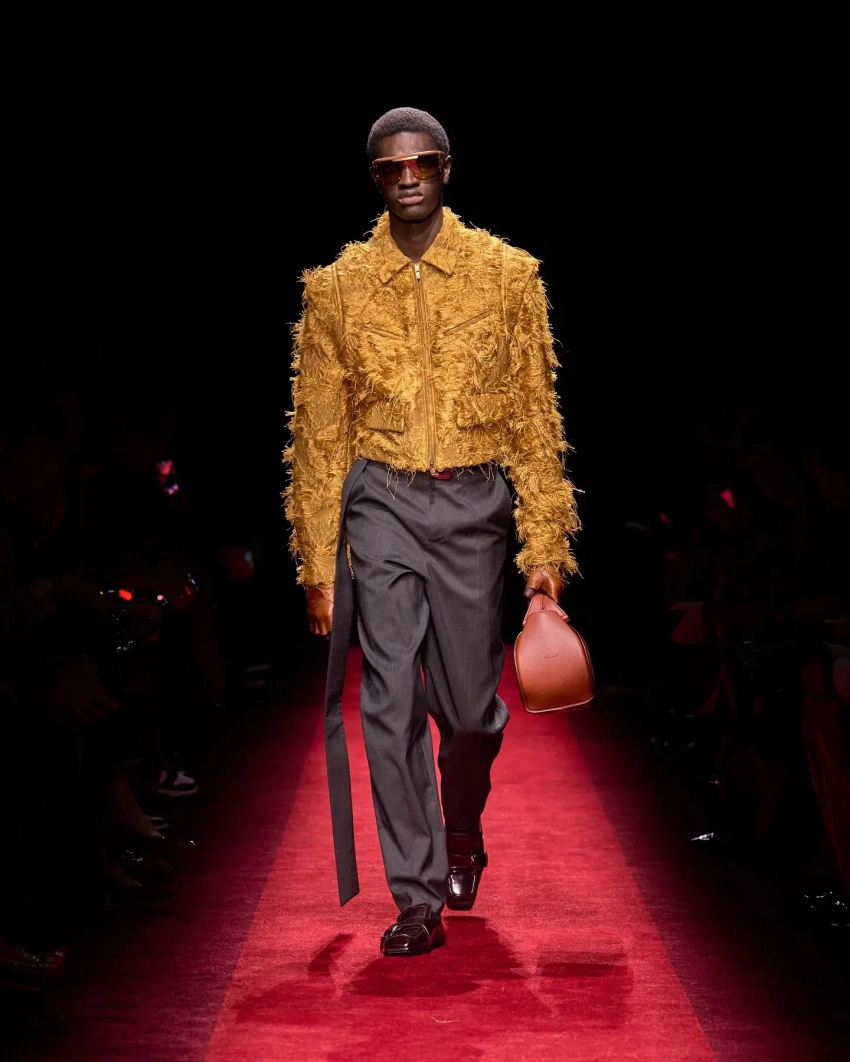 Карен Бланчард/Фото: ferraristyle/instagram*Под руководством креативного директора Рокко Янноне бренд представил коллекцию, вдохновлённую динамикой легендарных автомобилей Ferrari. Коллекция открылась с переосмысления делового стиля: серые плиссированные костюмы сочетались с массивными меховыми и верблюжьими пальто и дополнялись галстуками Rosso Corsa. Среди ключевых элементов коллекции — меховые пальто, золотые ткани с бахромой и кожаные аксессуары. Фирменной деталью, возвращающейся из сезона в сезон, стали перчатки — неизменный атрибут поклонников Ferrari.