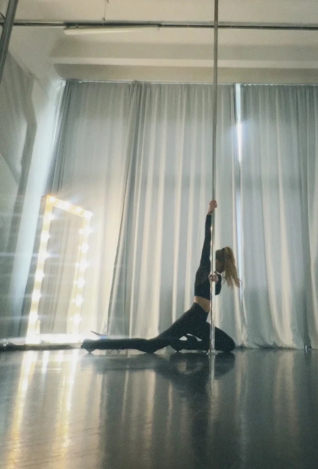 Светлана Ходченкова опубликовала в инстаграме* новые фотографии, которые сделала во время своих тренировок на пилоне. На снимках 42-летняя актриса позирует у шеста в откровенных позах, одетая в чёрный кроп-топ с длинными рукавами, лосины в тон и стрип-туфли на высоком каблуке и платформе.