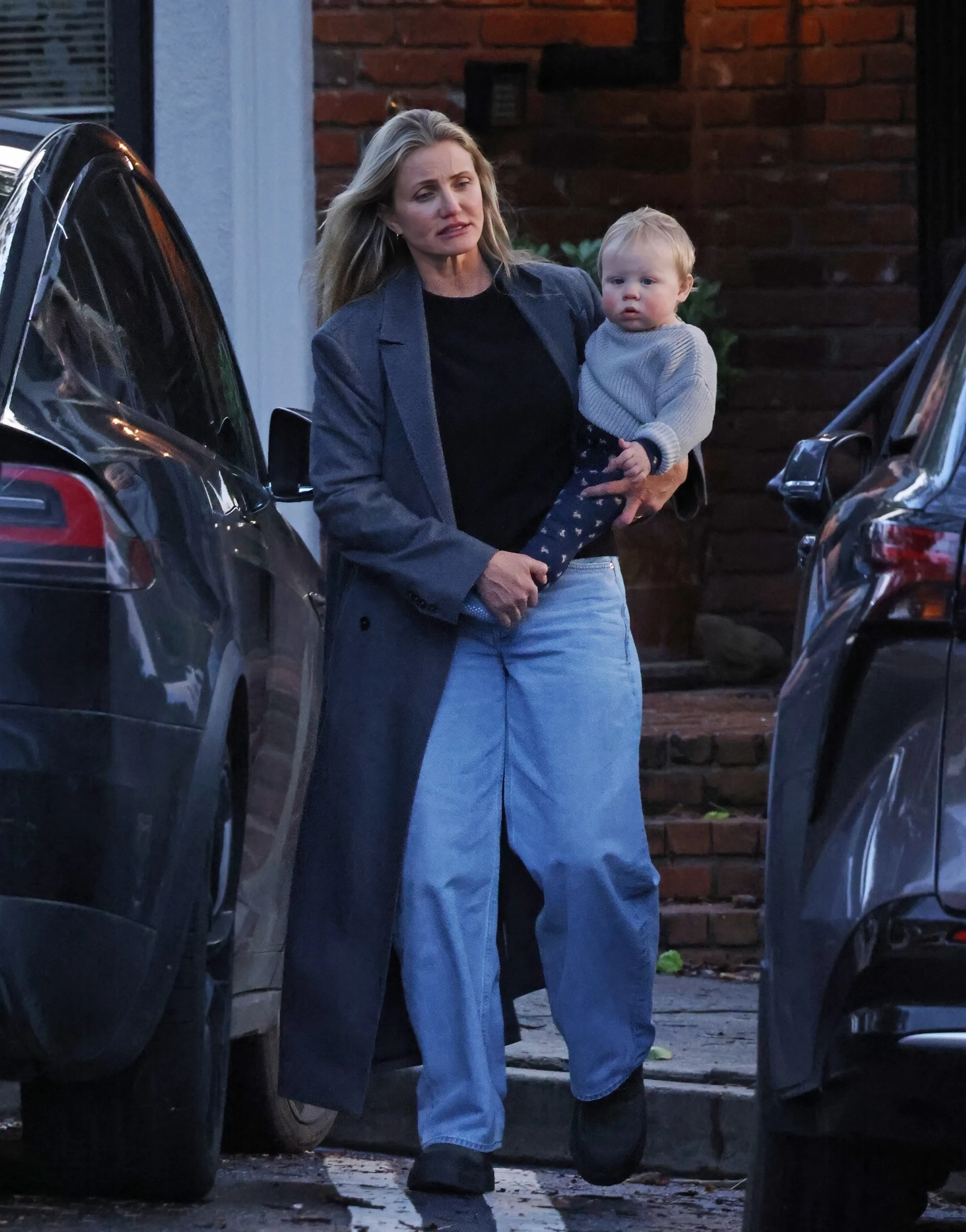 Звезда была одета в голубые джинсы, длинное серое пальто, черные футболку и кроссовки. Мальчика она держала на руках, не пытаясь скрыть его лицо.
