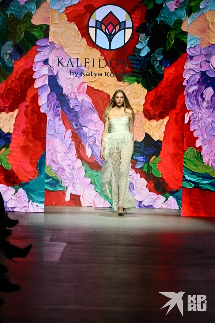 Красочную коллекцию представила дизайнер Екатерина Комбарова (бренд Maison Kaleidoscope by Katya Kombarova). В линейку вошли яркие трикотажные шелковые костюмы, а также кардиганы и топы, украшенные перьями. Все эти комплекты смело можно носить в конце весны и летом.
