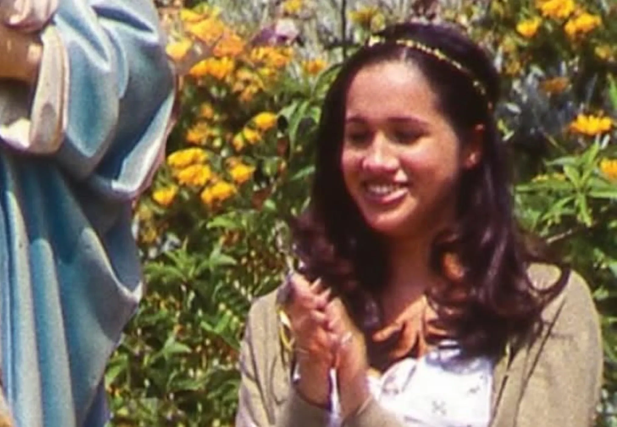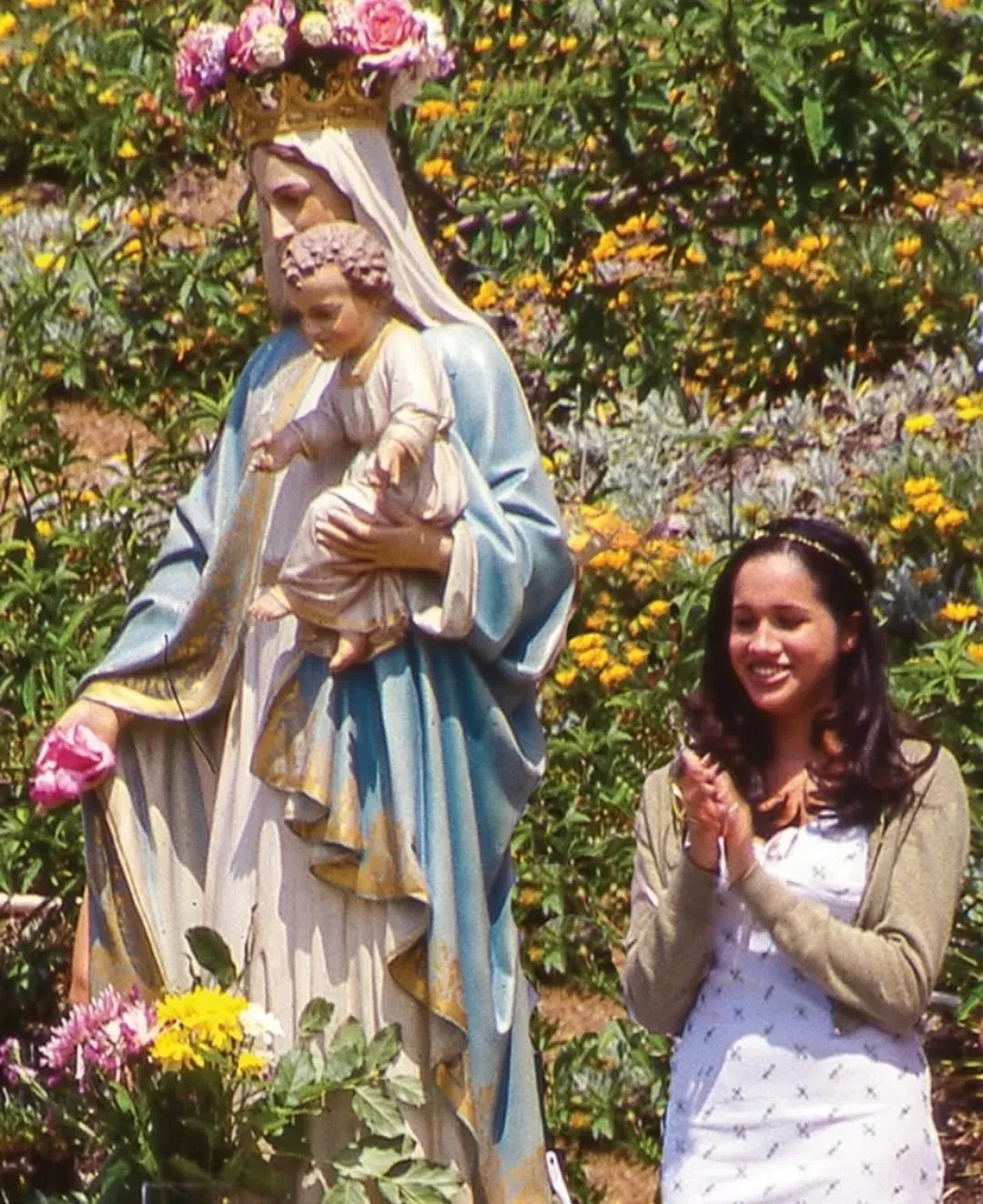 Меган Маркл опубликовала своё архивное фото в соцсетях. На снимке герцогиня Сассекская с улыбкой позирует на фоне статуи Девы Марии в 1999 году.