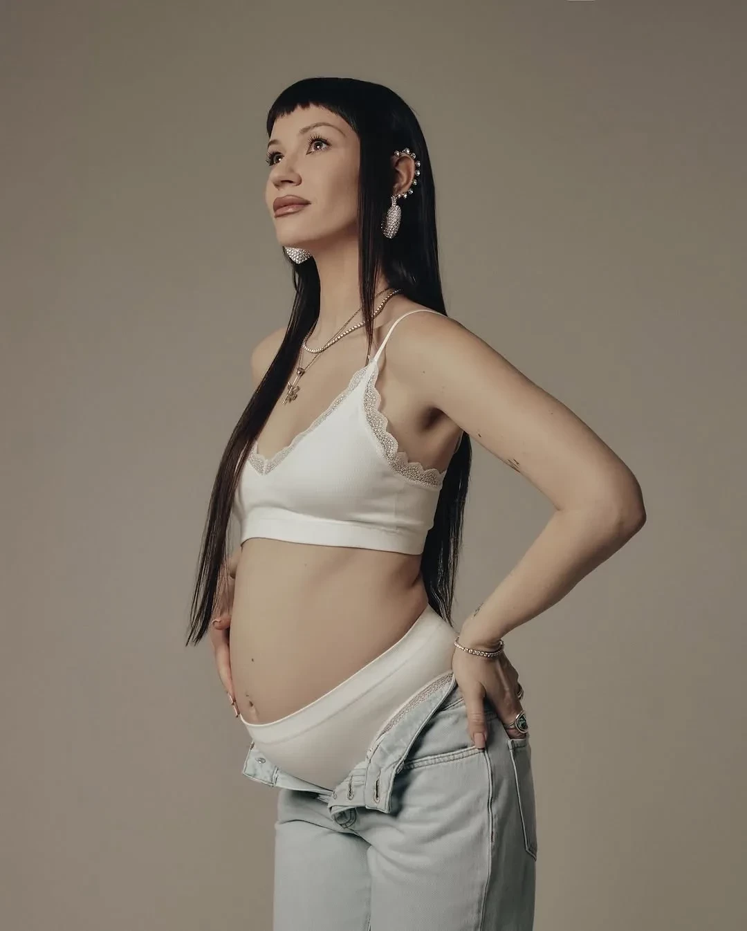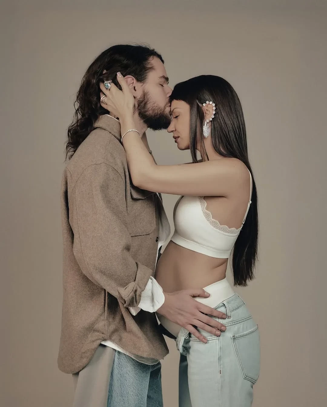 "Прекрасное время. Почти шесть месяцев у меня под сердцем маленький человек. Невероятно", — подписала Ида кадры, на которых она в белом белье и джинсах демонстрирует округлившийся живот и обнимает возлюбленного. Олег для семейной фотосессии нарядился в белую и коричневую рубашки.