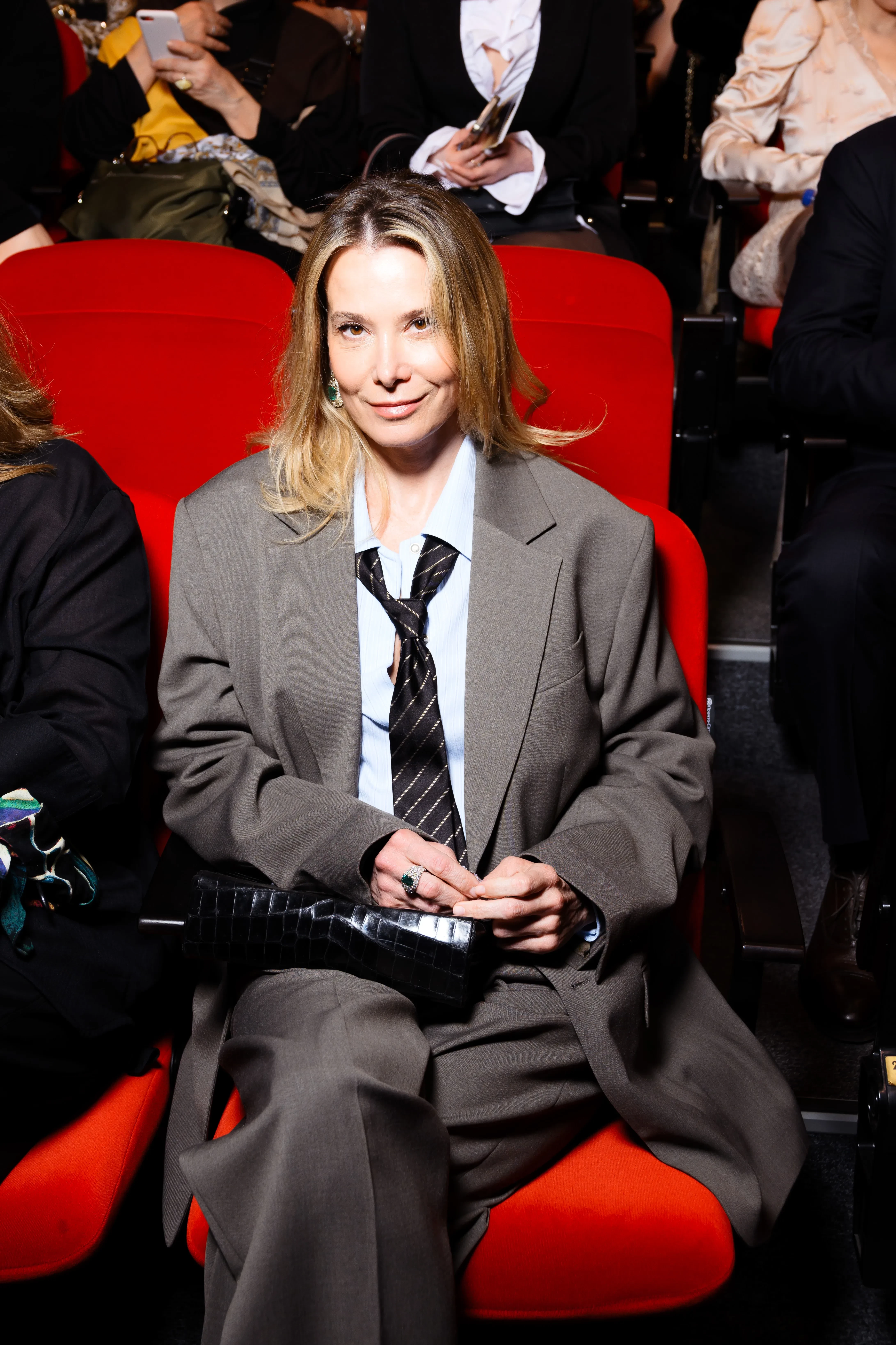 Для мероприятия 51-летняя Высоцкая выбрала свободный брючный костюм серого цвета с голубой рубашкой и чёрным галстуком в полоску. Её муж надел голубую рубашку, тёмный пиджак, спортивные брюки и свободную обувь.