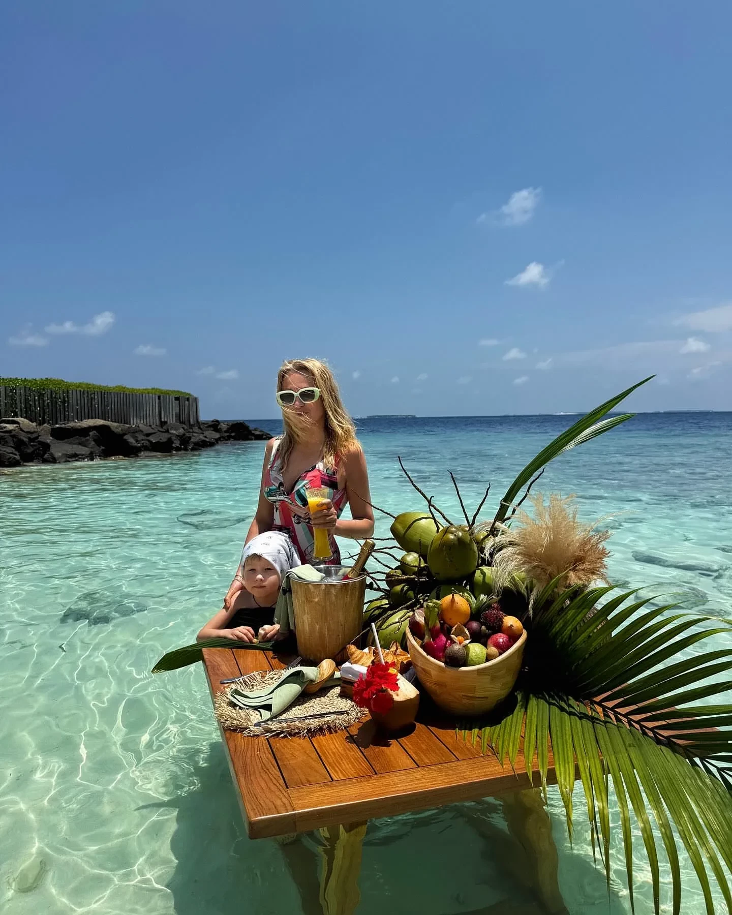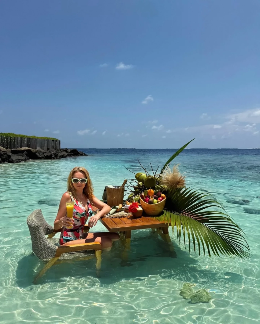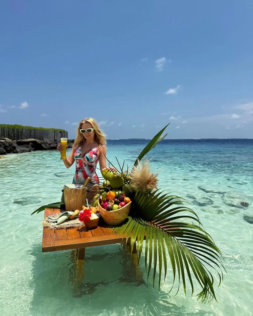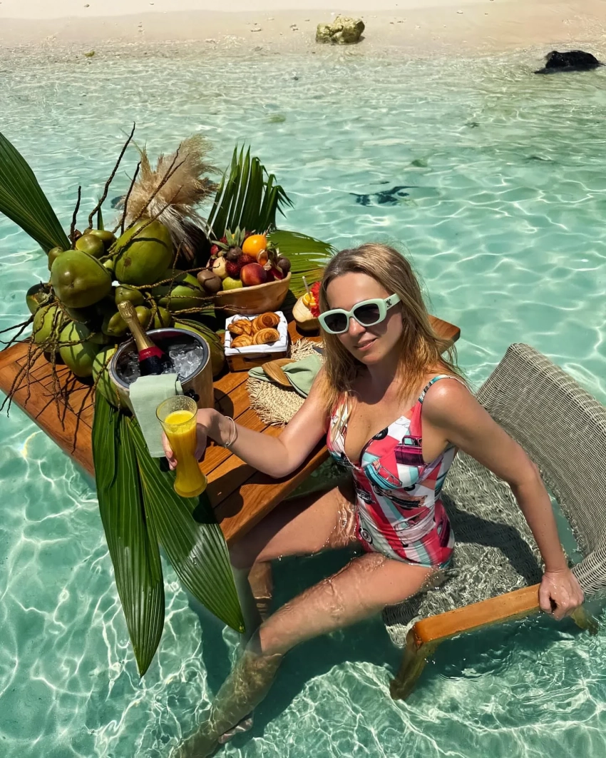 На новых снимках Рудковская стоит в воде, а рядом с ней расположен стол с фруктами, шампанским и веткой пальмы. Также на одном из снимков появился её младший сын Арсений. "Мой экзотический завтрак в раю", — подписала 50-летняя Рудковская фотографии.