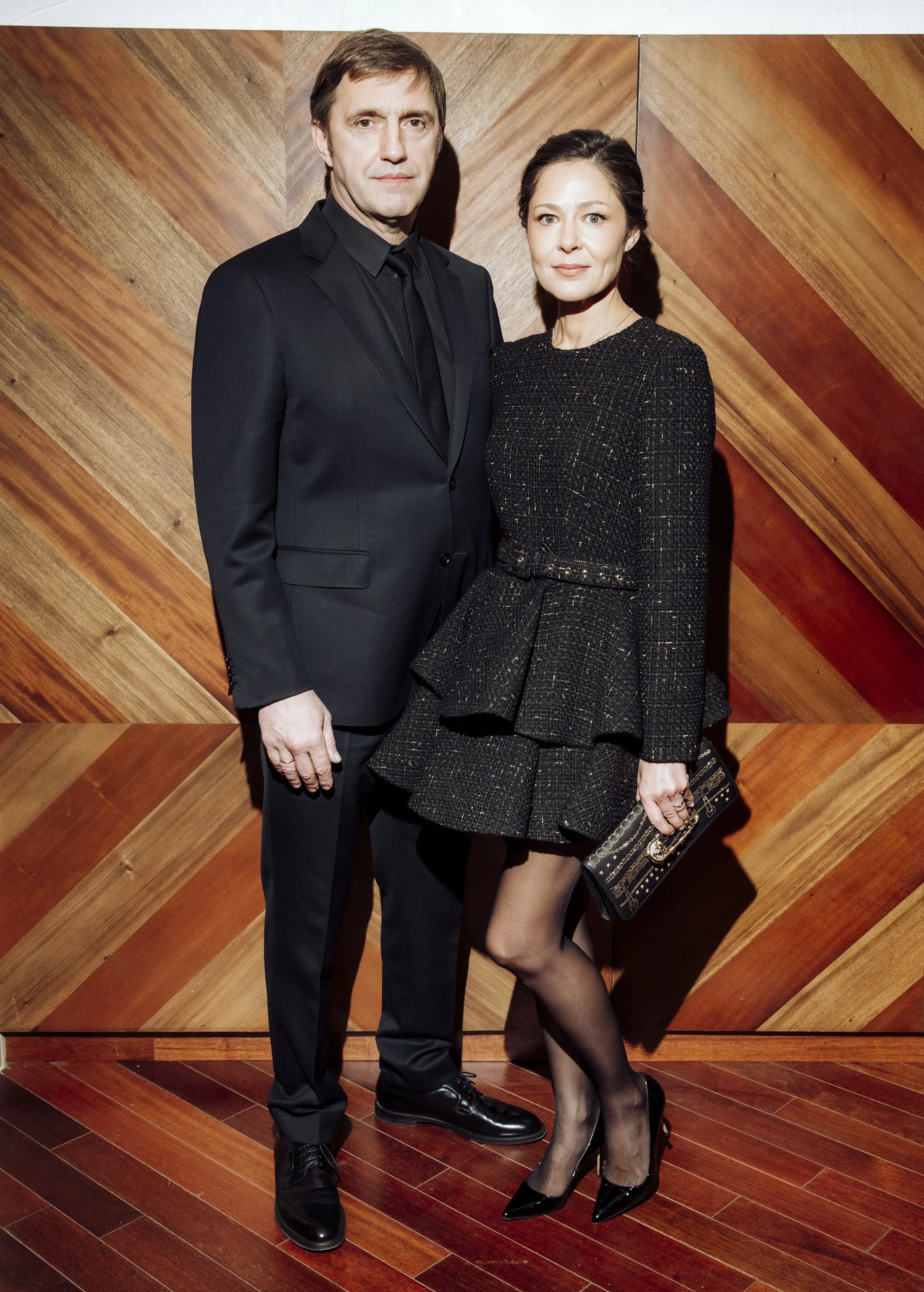 На дорожке Елена позировала в чёрном твидовом платье с расклёшенной юбкой, а Владимир надел образ total black и обнимал супругу перед фотографами.