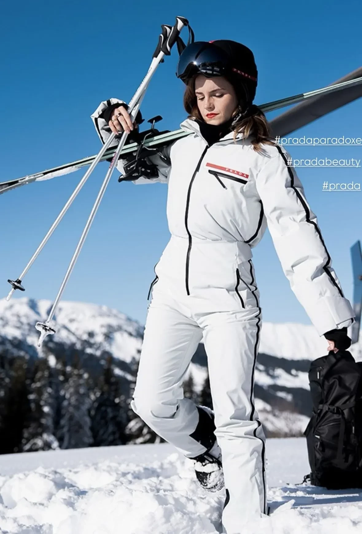 Звезда "Гарри Поттера" Эмма Уотсон снялась в новом кампейне аромата Prada Paradoxe, лицом которого она является с 2023 года. На снимках 34-летняя актриса в белом горнолыжном комбинезоне Prada и с красной помадой на губах позирует на склонах швейцарских гор в Церматте в вертолёте и с лыжами.