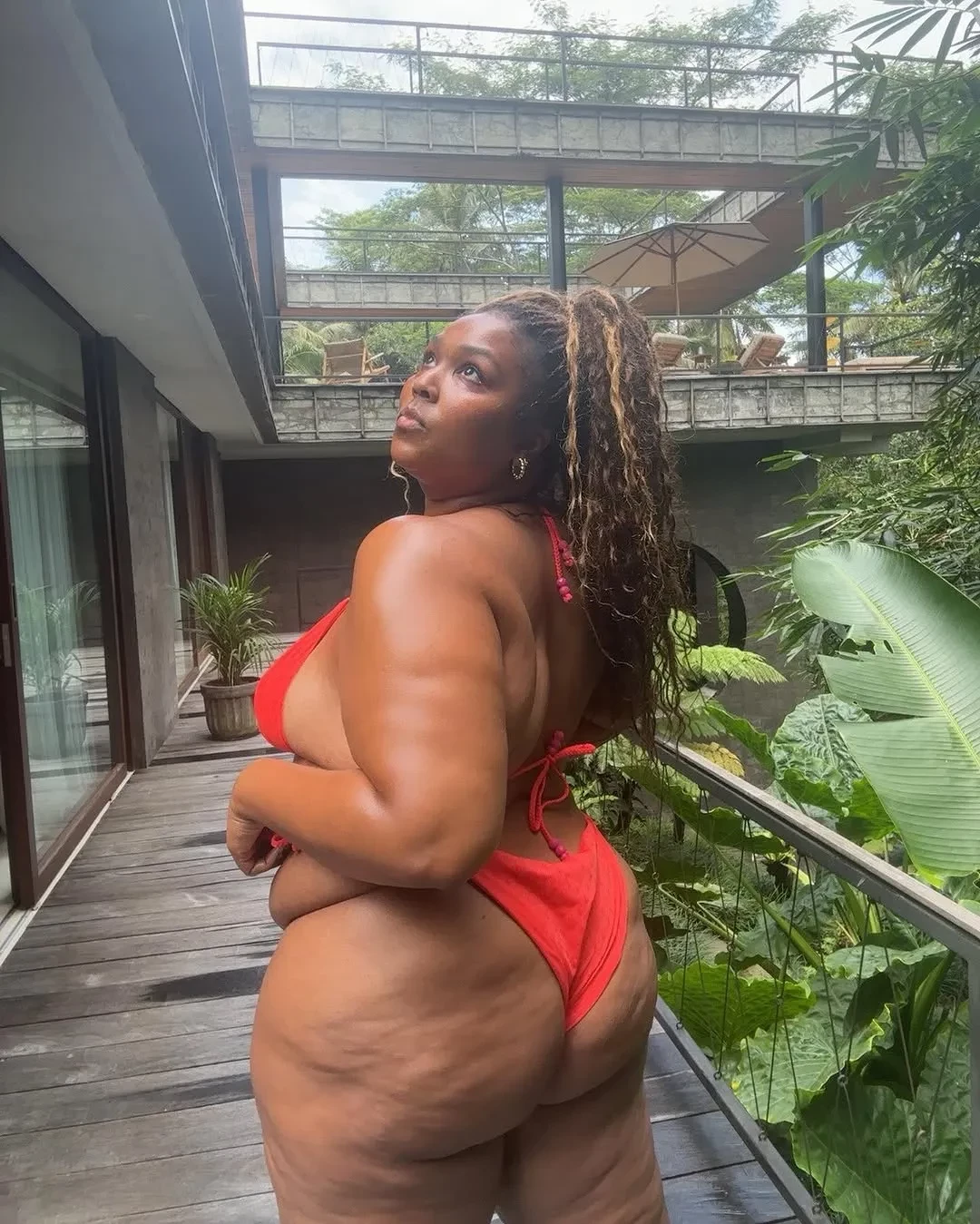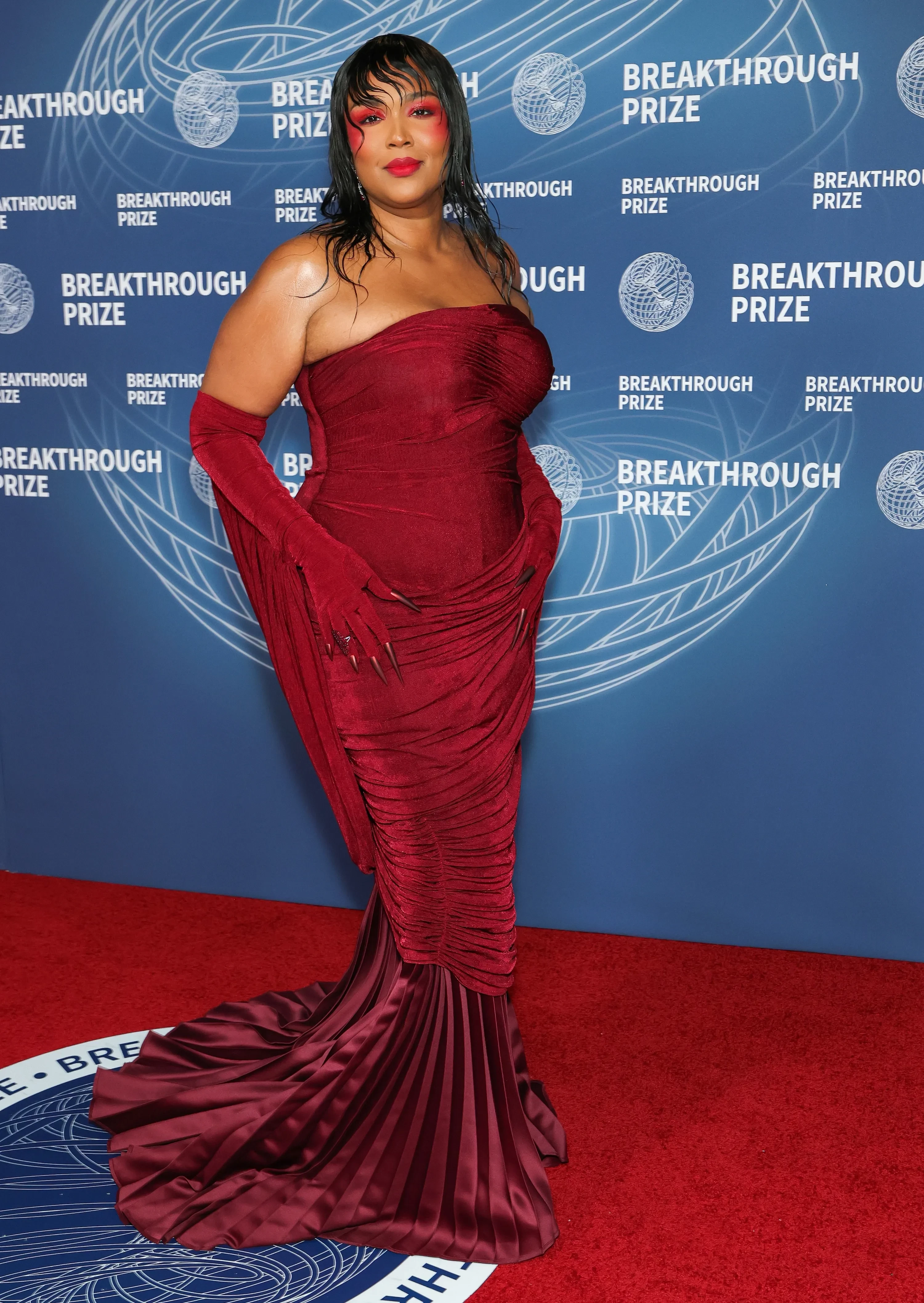 Лиззо позировала на дорожке в красном облегающем платье без бретелей и перчатках, дополнив образ макияжем в тон и "мокрой" укладкой.