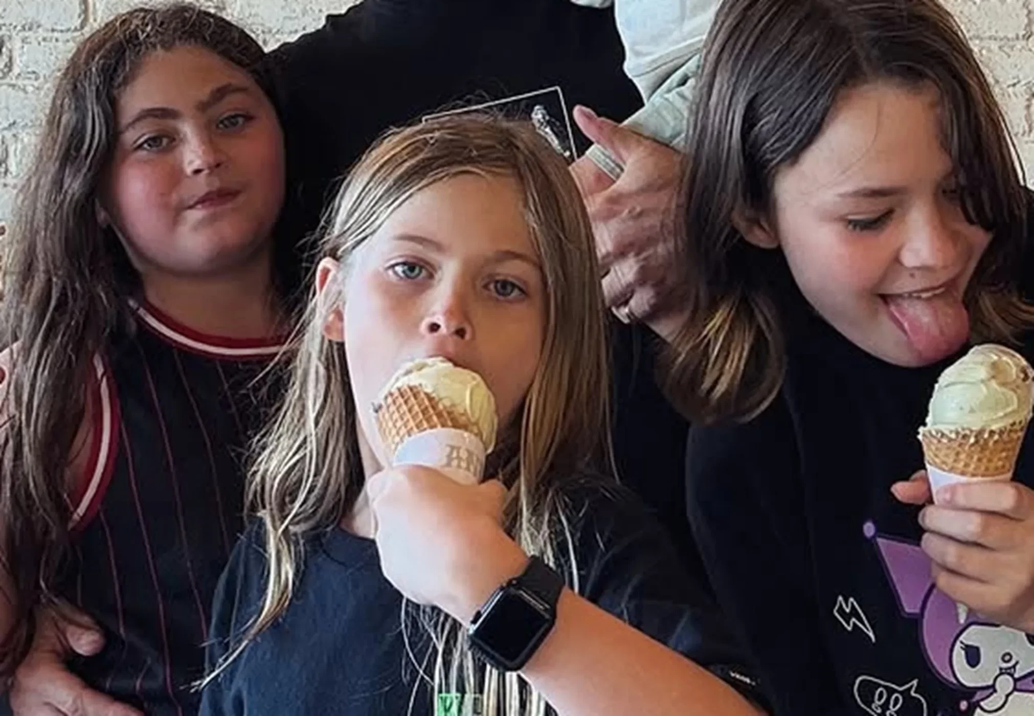 На снимке 12-летний Ноа, 11-летний Бодхи и восьмилетний Джорни запечатлены в кафе с отцом за поеданием мороженого. Грин держит на руках их с Бёрджесс двухлетнего первенца Зейна.
