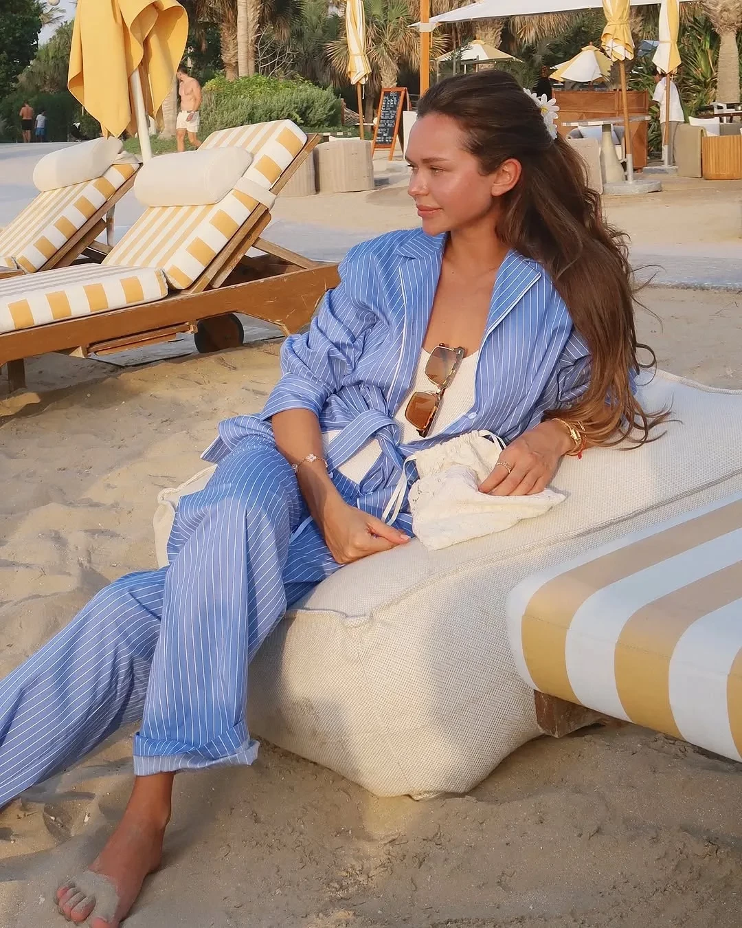 "La dolce vita! И немножко бомболони", — подписала снимки Стеша. В поездке она выгуляла голубой пижамный костюм в полоску, платье с цветочными принтом, которое дополнила сумкой Hermes и балетками Alaia, а также коричневый купальник.