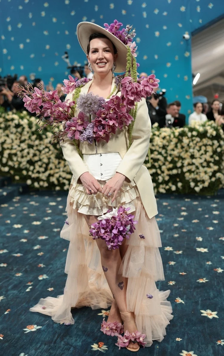Британский дизайнер Джессика Кайл в жакете с цветами и такой же нарядной шляпе напоминала клумбу.
