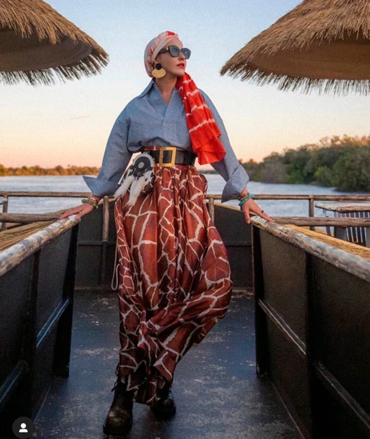 А вот Ксения простые образы не любит. В ее случае — чем навороченнее, тем лучше. Во время путешествия по Африке Собчак выгуляла эффектную юбку с принтом жирафа. «Я не знаю, как мне удалось, но я влезла в эту кутюрную жирафью юбку 2008 года от Roberto Cavalli», — похвасталась в своем блоге журналистка. Ее она сочетала с голубой рубашкой в полоску и грубыми ботинками. Дополнила образ ярким платком на голову, крупными украшениями и поясной сумкой с коровьим принтом, похожей на известный амулет — ловец снов. Что ж, Индиана Джонс нервно курит в сторонке.