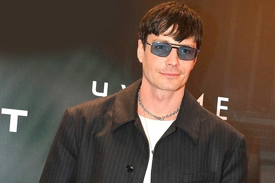 Исполнитель главной роли, 42-летний Максим Матвеев, как всегда выглядел очень стильно: брючный костюм в полоску нестандартного покроя, белая футболка и ботинки на каблуках. И, конечно же, аксессуары, которые актер обожает — цепь, кольца и очки и с синими линзами.