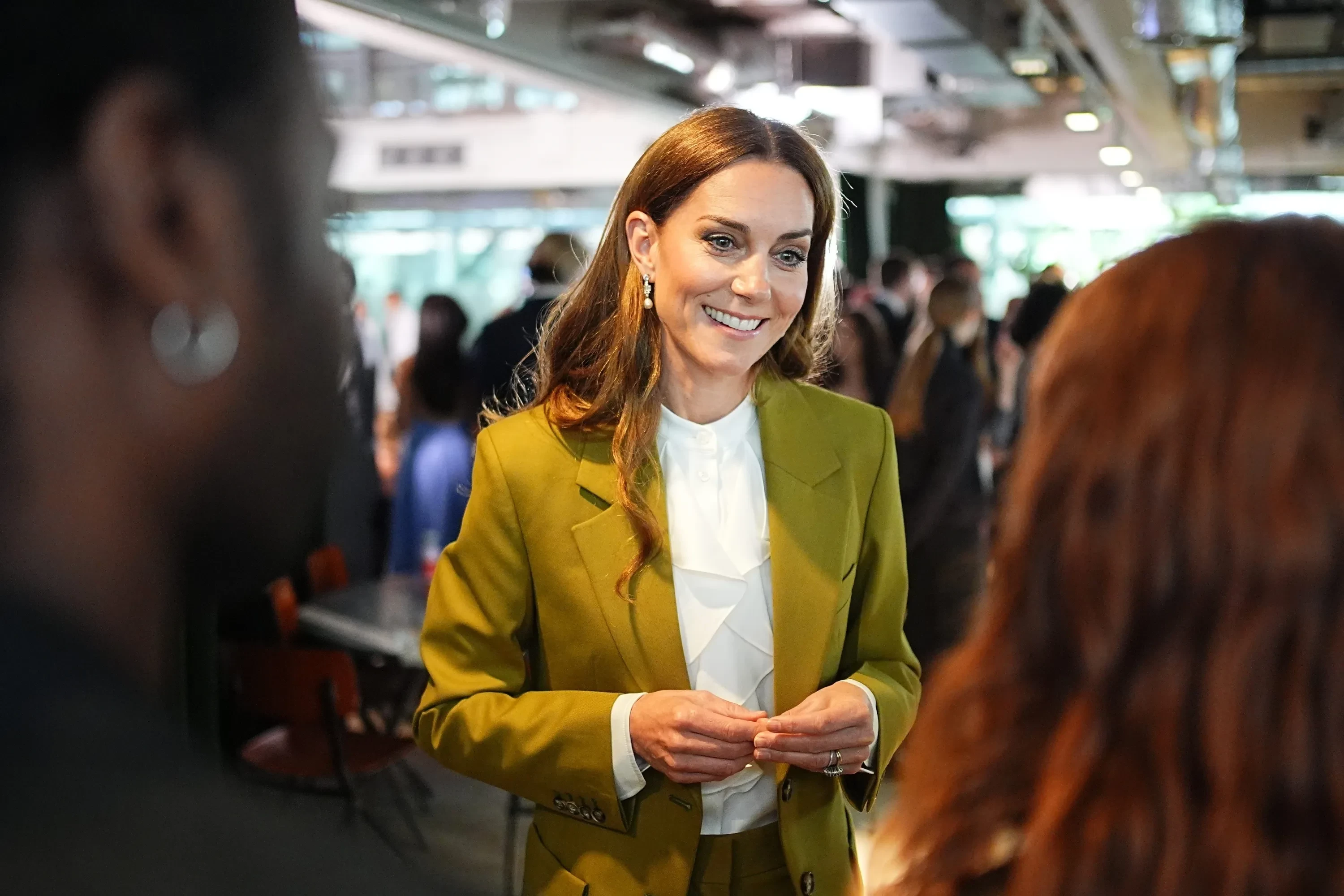 Для выхода принцесса Уэльская выбрала оливковый костюм Victoria Beckham, дополненный белой блузкой. Образ завершили бежевые туфли на шпильке Ralph Lauren и жемчужные серьги из коллекции королевы Елизаветы II.