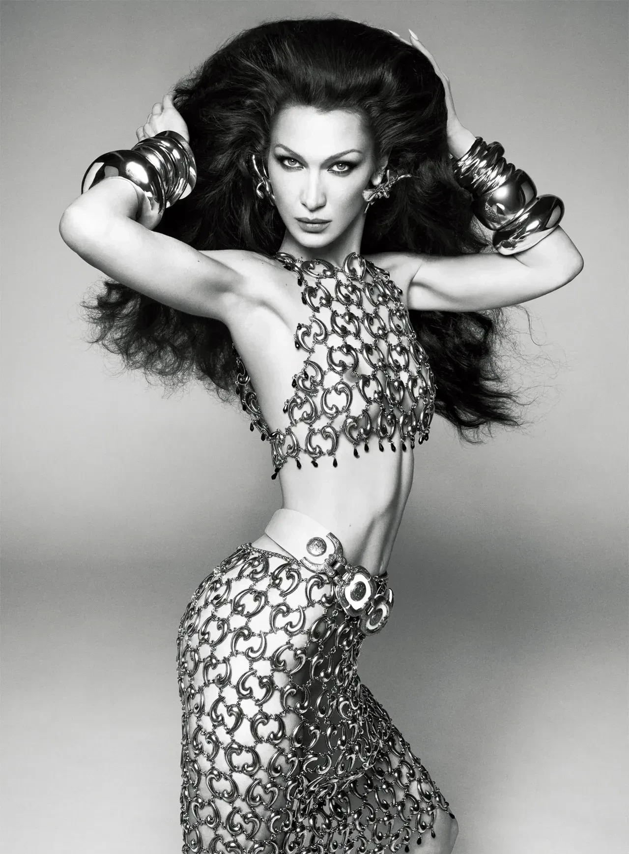 На обложке младшая сестра Джиджи Хадид позирует в Valentino, а на страницах издания — топлес, в прозрачном платье Dolce & Gabbana и "кольчуге" Chainmail.