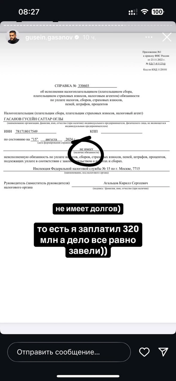 Гасанов опубликовал документ о том, что все налоги оплатил. Фото: личная страница Гусейна Гасанова в соцсетях.