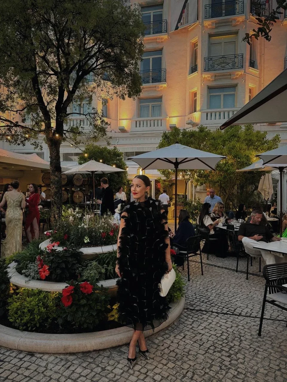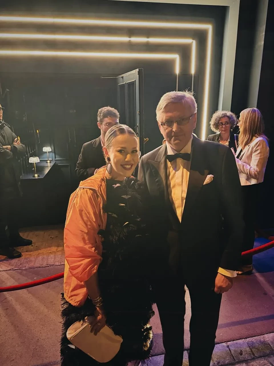 Для вечера Собчак выбрала чёрное платье с перьями в сочетании с ярко-оранжевой курткой на молнии из весенне-летней коллекции Prada 2025 года. Образ дополнили белый клатч и туфли на высоких каблуках с серебристым мысом. "Ну просто не смогла не добавить каплю футуристичности красной дорожке кинофестиваля", — отметила она в своём телеграм-канале.