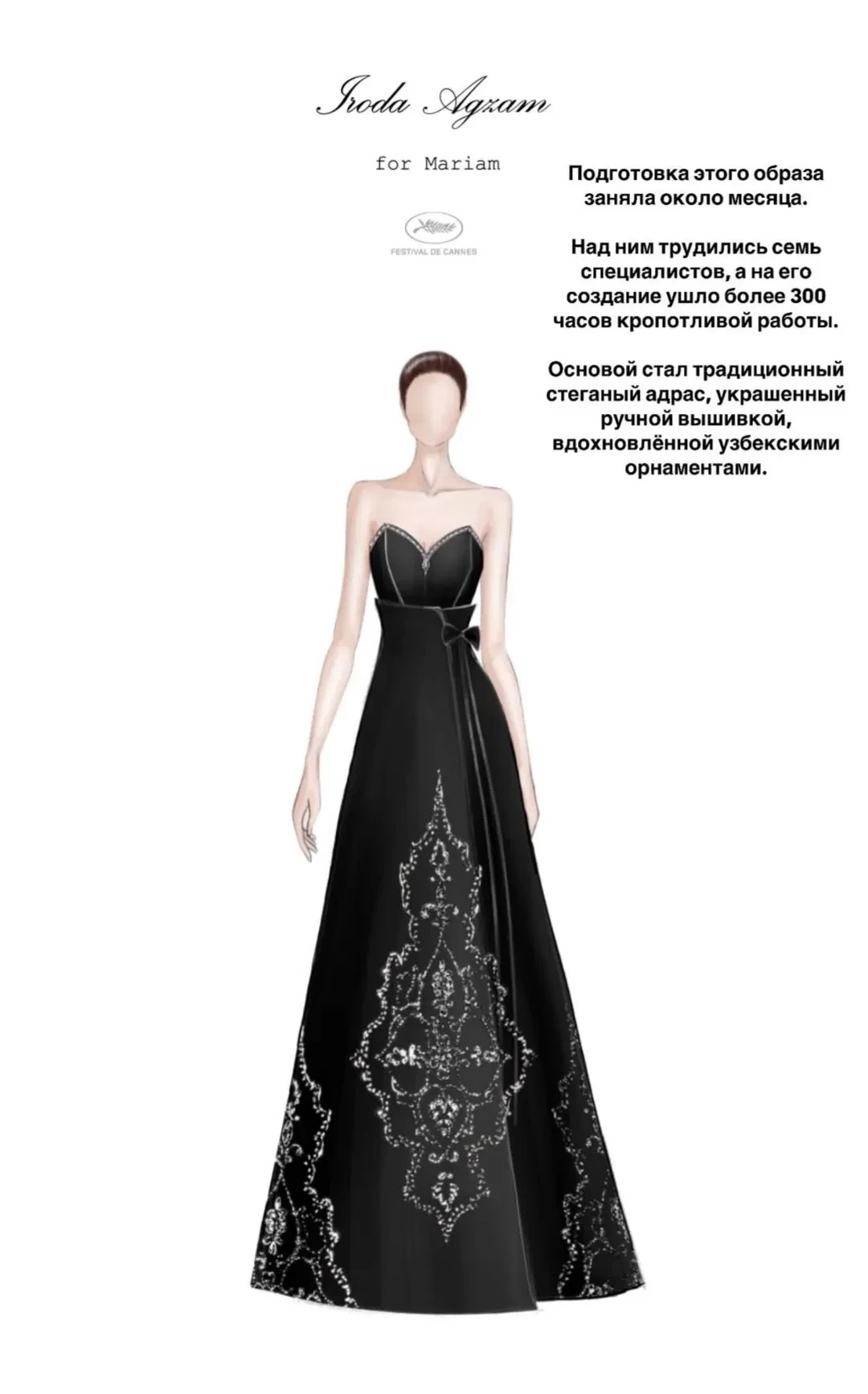 На красную дорожку она вышла вместе со своим новым бойфрендом Арно. Для события Марьям выбрала платье узбекского дизайнера Iroda Agzam, с ручной вышивкой — на его создание ушло более 300 часов работы. Ее образ дополняли украшения Pasquale Bruni.