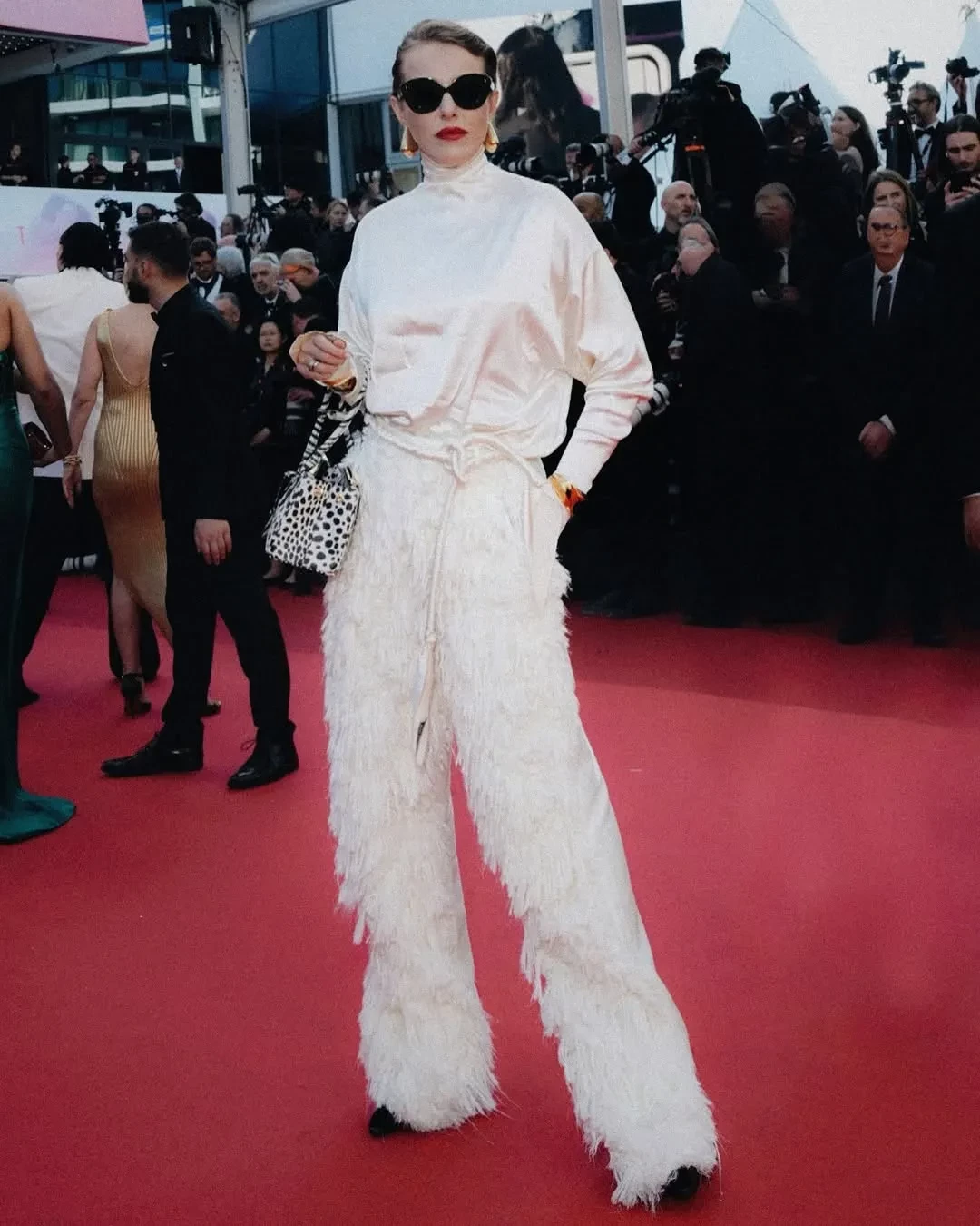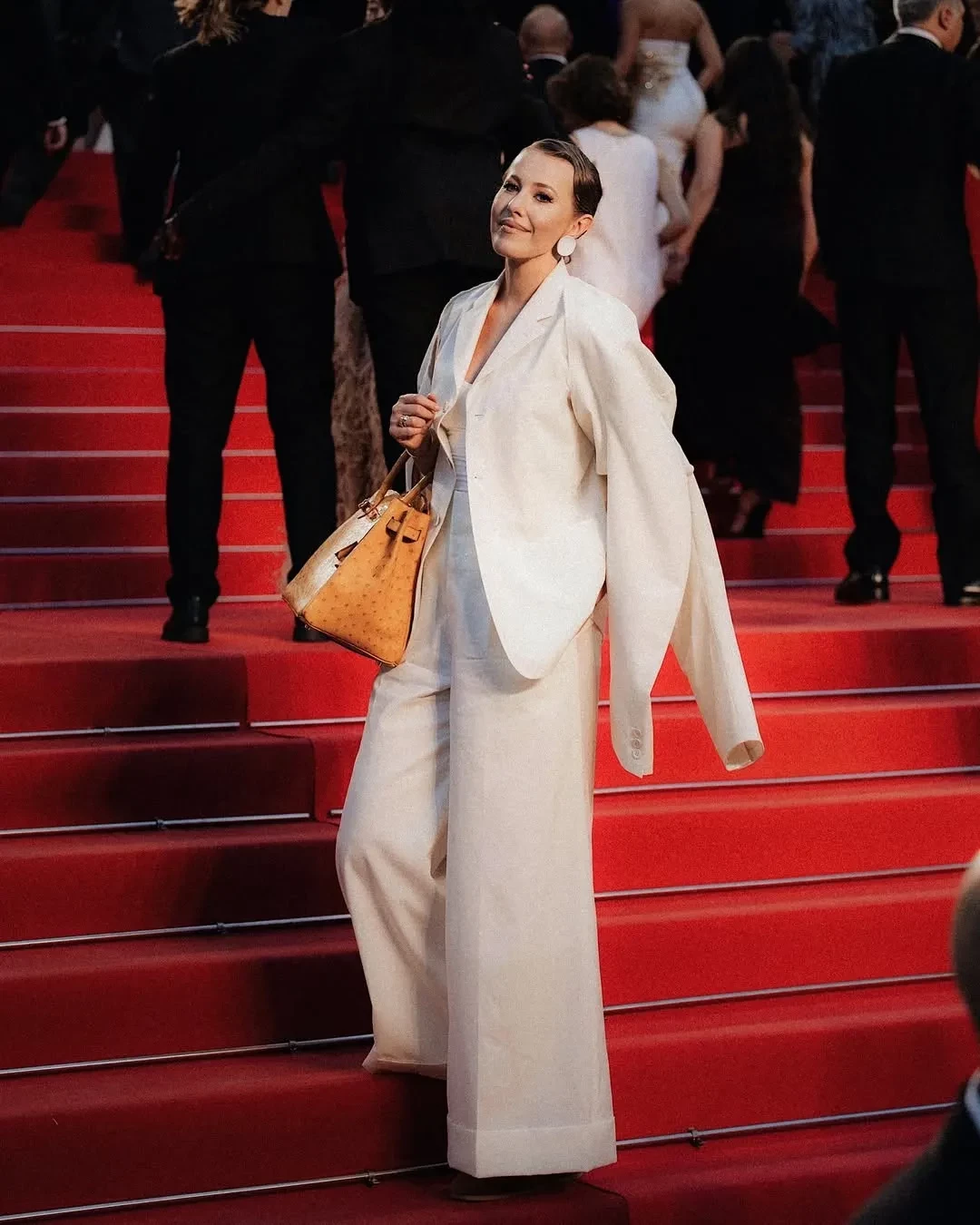 Ксения Собчак в этом году снова прилетела на фестиваль и посетила несколько премьер. На дорожку фильма "Два прокурора" 43-летняя ведущая вышла в тотал-луке Prada, надев платье с перьями с оранжевой ветровкой. На премьеру "Умри, моя любовь" Ксения пришла в "смирительной" рубашке-пиджаке Comme des Garçons и с сумкой Hermes Birkin, а на показе "Досье 137" позировала в костюме с "пушистыми" брюками Phoebe Philo и сумкой Prada. Свой образ Ксения иронично сравнила с персонажем Мистером Тумнусом из "Хроник Нарнии". На просмотр фильма "Эддингтон" Ксения пришла "на скромном": в платье Prada и пальто Comme des Garçons, дополнив образ меховой сумкой Maison Margiela.