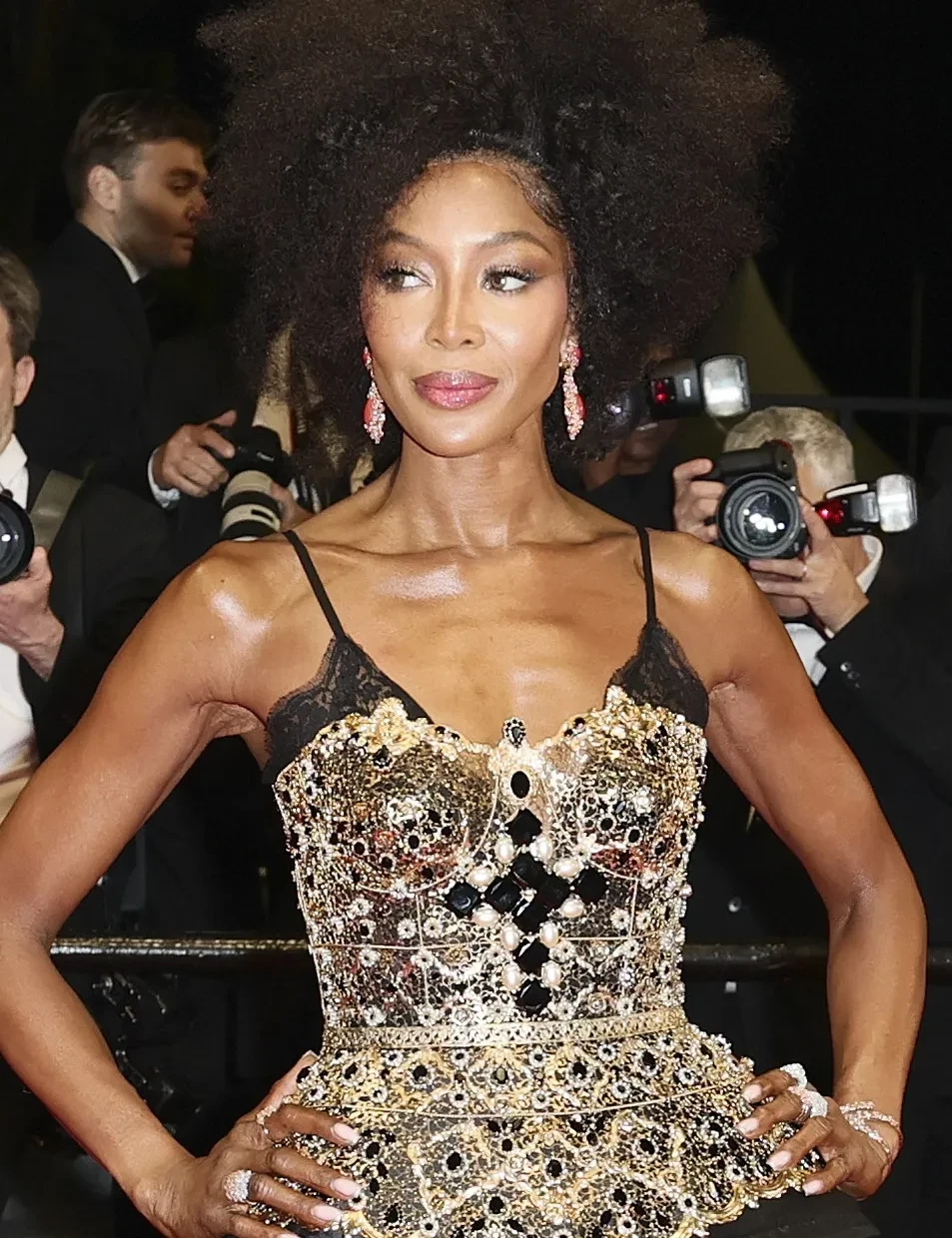 Перед камерами Кэмпбелл появилась в пышном чёрном платье с "золотым" корсетом. Свой образ она дополнила серьгами-подвесками и бриллиантовыми кольцами.