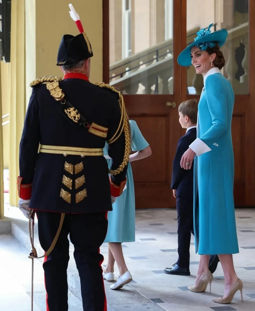 Кейт выбрала для мероприятия нежно-голубое платье-пальто Catherine Walker. Ее образ дополняли широкополая шляпа Juliette Botterill,  брошь с изображением полка Ирландской гвардии и серьги с бриллиантами и жемчугом, ранее принадлежавшие королеве Елизавете II.