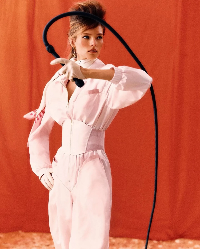 Алеся Кафельникова снялась в лукбуке новой круизной коллекции Ulyana Sergeenko. В объективе фотографа Нателлы Киселёвой 26-летняя модель предстала в образах, вдохновлённых эстетикой ретро-цирка и кабаре. В рамках съёмки она примерила красный и пудровый комбинезоны, кружевной комплект нежно-розового оттенка с юбкой с разрезом на бедре, корсетное мини-платье и другие наряды бренда.