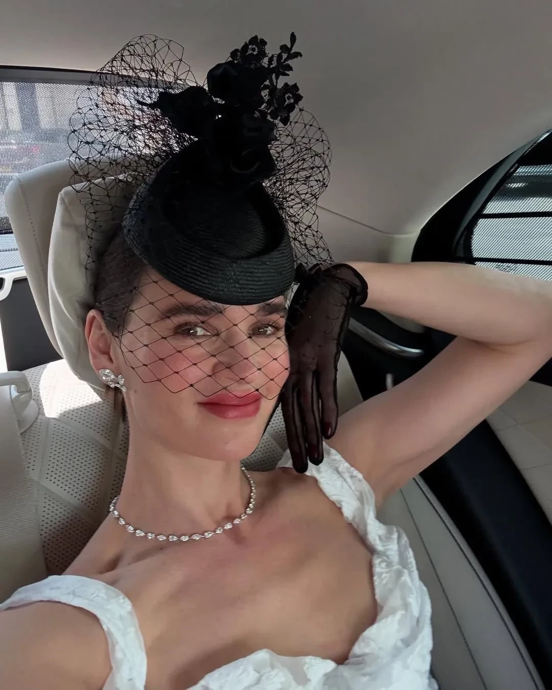 На снимках Татьяна, которая воспитывает четверых детей от водочного магната, купившего долю Анджелины Джоли в её с Брэдом Питтом поместье Château Miraval, позирует в белом кружевном платье, туфлях Dior и с сумкой Hermes. Модель дополнила образ чёрными перчатками, шляпой с вуалью и ювелирными украшениями.