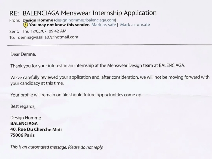 Письмо Демне Гвасалии от Balenciaga"Уважаемый Демна. Благодарим вас за интерес к стажировке в команде дизайнеров мужской одежды Balenciaga. Мы внимательно изучили ваше письмо и не рассматриваем вашу кандидатуру в данный момент. Ваше резюме останется в нашем архиве на случай появления новых возможностей. Всего наилучшего", — говорится в письме.