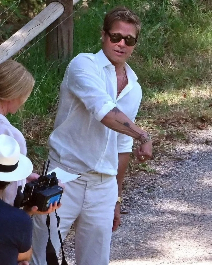 Так, в трейлере "Формулы" Питт появляется с обнажённым торсом, демонстрируя внушительную коллекцию татуировок. Его тело украшено знаками, буквами и разнообразными изображениями, среди которых скелет кентавра, торнадо и японские карпы. Особое внимание привлекает крупная татуировка на животе: её начало представляет собой букву "А", отсылающую к слову "альфа", тогда как в другом месте видна надпись "омега" — вместе эти элементы символизируют начало и конец. На спине актёра набита цитата из песни Боба Дилана When the Deal Goes Down: "Мы живём и умираем, не зная почему. Но я буду с тобой, когда сделка сорвётся". Однако наибольший интерес вызывает надпись на нижней части живота — это дата рождения Анджелины Джоли, его бывшей жены, выполненная кхмерскими символами.
