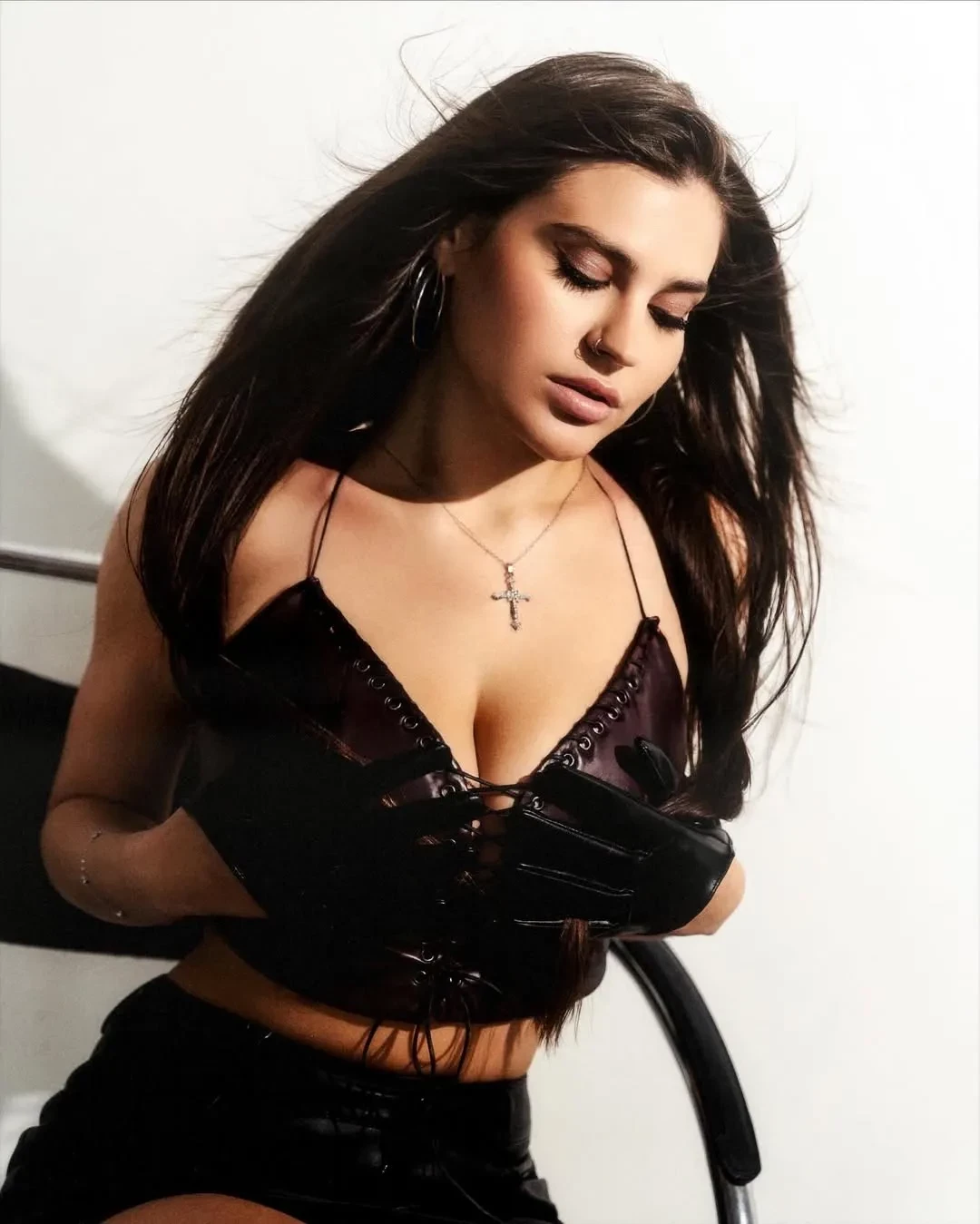 26-летняя внучка Михаила Боярского продемонстрировала фигуру в новой фотосессии, снимки с которой опубликовала в своём инстаграме*. В кадре Екатерина предстала в кожаном комплекте из топа на шнуровке и мини-юбки.