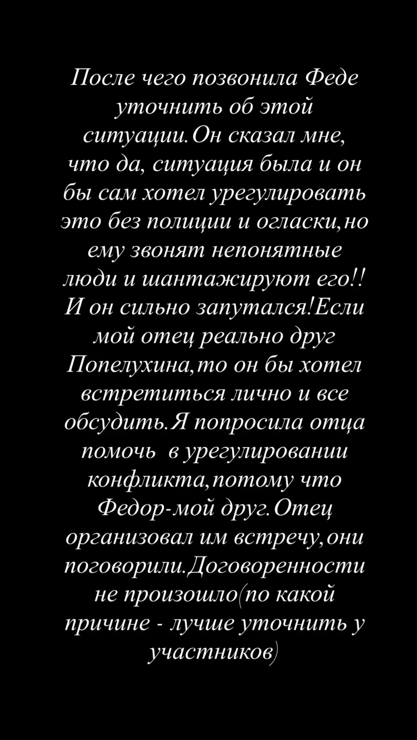 Так, Дарья рассказала, что один из пострадавших, бизнесмен Андрей Попелуха, является другом её отца. После инцидента Попелуха, желая уладить ситуацию без привлечения правоохранительных органов, якобы связался с Русланом Валитовым и поинтересовался, знает ли тот Смолова. Отец Дарьи, в свою очередь, обратился к ней, чтобы уточнить, в каких отношениях она находится с футболистом. "Я позвонила Феде, чтобы уточнить об этой ситуации. Он сказал мне, что ситуация была, он бы сам хотел урегулировать это без полиции и огласки, но ему звонят непонятные люди и шантажируют его. И он сильно запутался", — отметила Валитова.
