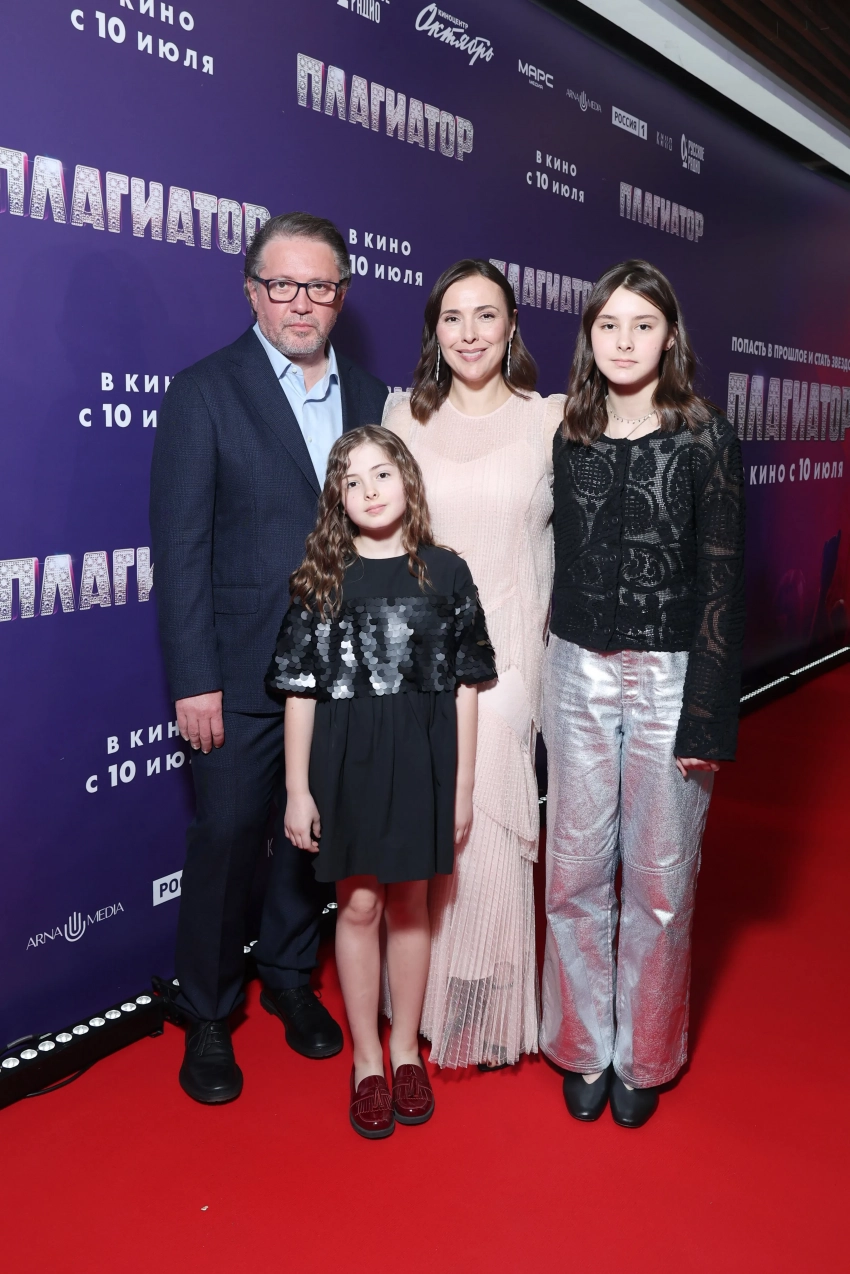 Юлия Снигирь, Стася Милославская с женихом и Марат Башаров с дочерью на премьере фильма "Плагиатор"