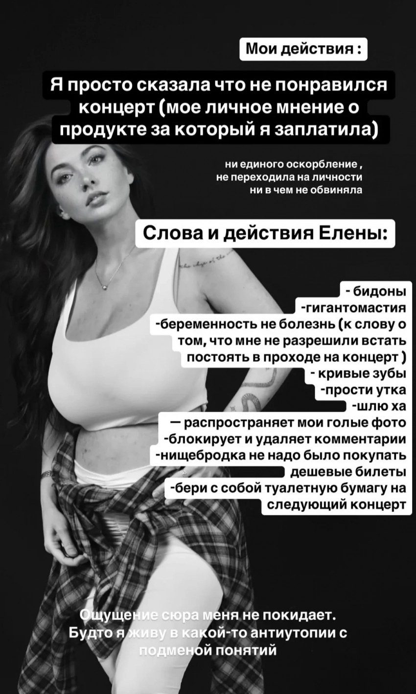 “Девушка пыталась хайпиться на видео с концерта, чтобы нагнать на свой аккаунт просмотры, так как она продает свои фото и видео эротического и порно характера на онлифанс и boosty18+. Мне это видео и её хайп показались омерзительными, я её решила задеть равнозначно, высказалась о предмете её работы (пышных формах), на них она строит весь свой контент, а это значит нет перехода на личность. Это продукт её работы, то что она продаёт. Значит, я могу оценить его так же, как она оценила концерт/работу моего мужа”, — написала Елена в своём телеграм-канале.