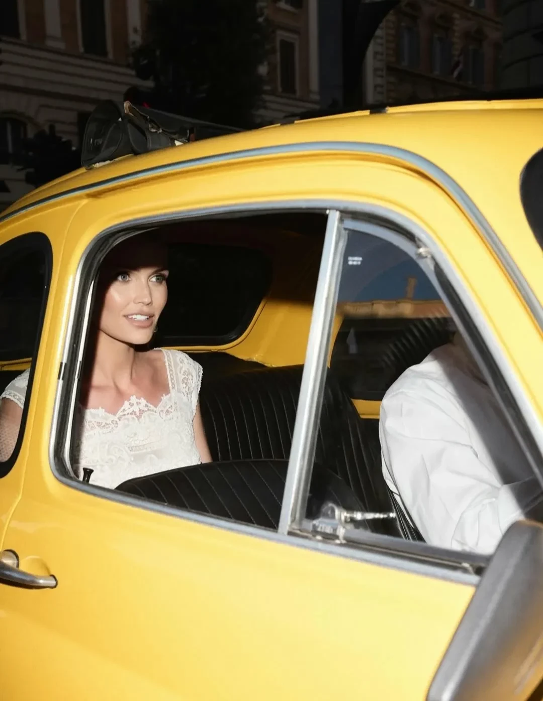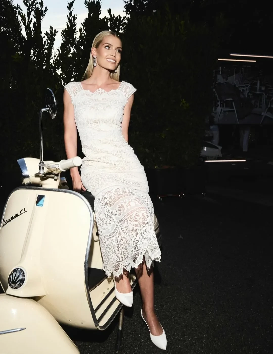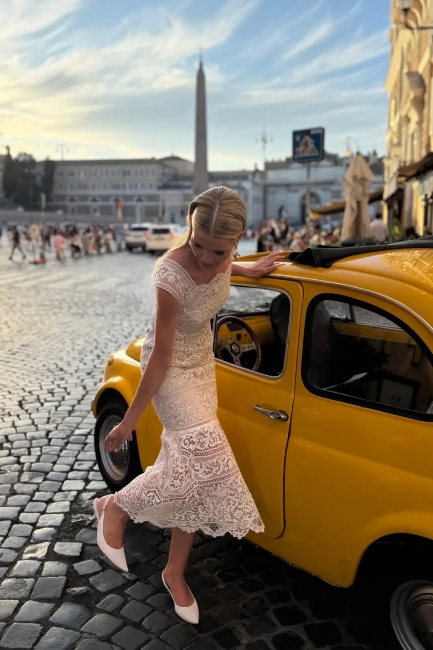 Появление Китти на вечеринке вышло эффектным: она приехала на винтажном жёлтом "фиате". В своих соцсетях Спенсер продемонстрировала свой образ в тот вечер: белое кружевное платье миди, в тон к которому она подобрала туфли и клатч.